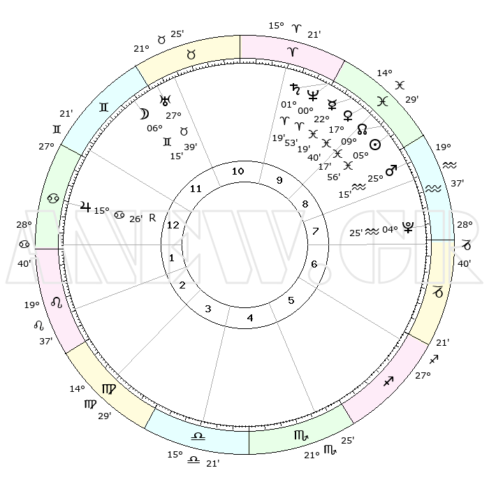 | | ΘΕΣΕΙΣ ΠΛΑΝΗΤΩΝ ΑΣΤΡΟΛΟΓΙΚΟΥ ΧΑΡΤΗ ΤΗΣ ΣΤΙΓΜΗΣ ΑΥΤΗΣ | | | | Πλανήτης | Ζώδιο | Μοίρες | Δεκαήμ. | Σε οίκο | Απόκλιση | | Ακμές των οίκων | | Ηλιος | Ιχθείς | 05°52' | Πρώτο | 9 | 09 S 22 | | 1ος | 07°39' | Καρκίνος | | Σελήνη | Δίδυμοι | 05°16' | Πρώτο | 12 | 26 N 21 | | 2ος | 28°08' | Καρκίνος | | Ερμής | Ιχθείς | 22°18' | Τρίτο | 10 | 00 S 52 | | 3ος | 20°32' | Λέων | | Αφροδίτη | Ιχθείς | 17°35' | Δεύτερο | 9 | 06 S 13 | | 4ος | 18°07' | Παρθένος | | Αρης | Υδροχόος | 25°11' | Τρίτο | 9 | 14 S 09 | | 5ος | 23°07' | Ζυγός | | Δίας | Καρκίνος | 15°26'R | Δεύτερο | 1 | 22 N 53 | | 6ος | 02°22' | Τοξότης | | Κρόνος | Κριός | 01°18' | Πρώτο | 10 | 01 S 27 | | 7ος | 07°39' | Αιγόκερως | | Ουρανός | Ταύρος | 27°39' | Τρίτο | 11 | 19 N 27 | | 8ος | 28°08' | Αιγόκερως | | Ποσειδώνας | Κριός | 00°53' | Πρώτο | 10 | 00 S 51 | | 9ος | 20°32' | Υδροχόος | | Πλούτωνας | Υδροχόος | 04°25' | Πρώτο | 8 | 22 S 54 | | 10ος | 18°07' | Ιχθείς | | Β. Δεσμός | Ιχθείς | 09°17' | Πρώτο | 9 | 08 S 05 | | 11ος | 23°07' | Κριός | | Ωροσκόπος | Καρκίνος | 07°39' | Πρώτο | | | 12ος | 02°22' | Δίδυμοι | | Μεσουράνημα | Ιχθείς | 18°07' | Δεύτερο | | | |