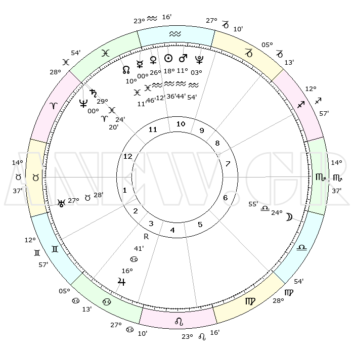 | | ΘΕΣΕΙΣ ΠΛΑΝΗΤΩΝ ΑΣΤΡΟΛΟΓΙΚΟΥ ΧΑΡΤΗ ΤΗΣ ΣΤΙΓΜΗΣ ΑΥΤΗΣ | | | | Πλανήτης | Ζώδιο | Μοίρες | Δεκαήμ. | Σε οίκο | Απόκλιση | | Ακμές των οίκων | | Ηλιος | Υδροχόος | 18°32' | Δεύτερο | 11 | 15 S 16 | | 1ος | 03°30' | Κριός | | Σελήνη | Ζυγός | 23°60' | Τρίτο | 7 | 12 S 45 | | 2ος | 12°56' | Ταύρος | | Ερμής | Ιχθείς | 00°39' | Πρώτο | 12 | 12 S 27 | | 3ος | 09°48' | Δίδυμοι | | Αφροδίτη | Υδροχόος | 26°06' | Τρίτο | 12 | 14 S 10 | | 4ος | 01°58' | Καρκίνος | | Αρης | Υδροχόος | 11°41' | Δεύτερο | 11 | 18 S 18 | | 5ος | 24°26' | Καρκίνος | | Δίας | Καρκίνος | 16°42'R | Δεύτερο | 4 | 22 N 42 | | 6ος | 22°23' | Λέων | | Κρόνος | Ιχθείς | 29°24' | Τρίτο | 12 | 02 S 13 | | 7ος | 03°30' | Ζυγός | | Ουρανός | Ταύρος | 27°28' | Τρίτο | 2 | 19 N 24 | | 8ος | 12°56' | Σκορπιός | | Ποσειδώνας | Κριός | 00°20' | Πρώτο | 12 | 01 S 05 | | 9ος | 09°48' | Τοξότης | | Πλούτωνας | Υδροχόος | 03°54' | Πρώτο | 11 | 22 S 59 | | 10ος | 01°58' | Αιγόκερως | | Β. Δεσμός | Ιχθείς | 10°12' | Δεύτερο | 12 | 07 S 45 | | 11ος | 24°26' | Αιγόκερως | | Ωροσκόπος | Κριός | 03°30' | Πρώτο | | | 12ος | 22°23' | Υδροχόος | | Μεσουράνημα | Αιγόκερως | 01°58' | Πρώτο | | | |