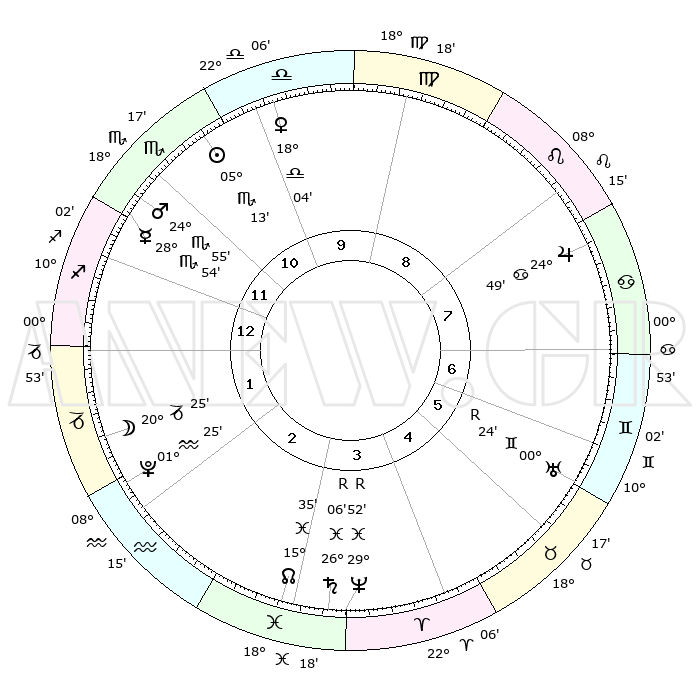 | | ΘΕΣΕΙΣ ΠΛΑΝΗΤΩΝ ΑΣΤΡΟΛΟΓΙΚΟΥ ΧΑΡΤΗ ΤΗΣ ΣΤΙΓΜΗΣ ΑΥΤΗΣ | | | | Πλανήτης | Ζώδιο | Μοίρες | Δεκαήμ. | Σε οίκο | Απόκλιση | | Ακμές των οίκων | | Ηλιος | Σκορπιός | 04°47' | Πρώτο | 3 | 13 S 07 | | 1ος | 24°54' | Λέων | | Σελήνη | Αιγόκερως | 15°12' | Δεύτερο | 5 | 27 S 04 | | 2ος | 18°13' | Παρθένος | | Ερμής | Σκορπιός | 28°26' | Τρίτο | 4 | 22 S 32 | | 3ος | 16°24' | Ζυγός | | Αφροδίτη | Ζυγός | 17°32' | Δεύτερο | 3 | 05 S 29 | | 4ος | 19°13' | Σκορπιός | | Αρης | Σκορπιός | 24°37' | Τρίτο | 4 | 19 S 16 | | 5ος | 23°46' | Τοξότης | | Δίας | Καρκίνος | 24°48' | Τρίτο | 11 | 21 N 14 | | 6ος | 26°10' | Αιγόκερως | | Κρόνος | Ιχθείς | 26°07'R | Τρίτο | 8 | 03 S 49 | | 7ος | 24°54' | Υδροχόος | | Ουρανός | Δίδυμοι | 00°25'R | Πρώτο | 10 | 20 N 02 | | 8ος | 18°13' | Ιχθείς | | Ποσειδώνας | Ιχθείς | 29°52'R | Τρίτο | 8 | 01 S 18 | | 9ος | 16°24' | Κριός | | Πλούτωνας | Υδροχόος | 01°25' | Πρώτο | 6 | 23 S 31 | | 10ος | 19°13' | Ταύρος | | Β. Δεσμός | Ιχθείς | 15°37' | Δεύτερο | 7 | 05 S 40 | | 11ος | 23°46' | Δίδυμοι | | Ωροσκόπος | Λέων | 24°54' | Τρίτο | | | 12ος | 26°10' | Καρκίνος | | Μεσουράνημα | Ταύρος | 19°13' | Δεύτερο | | | |