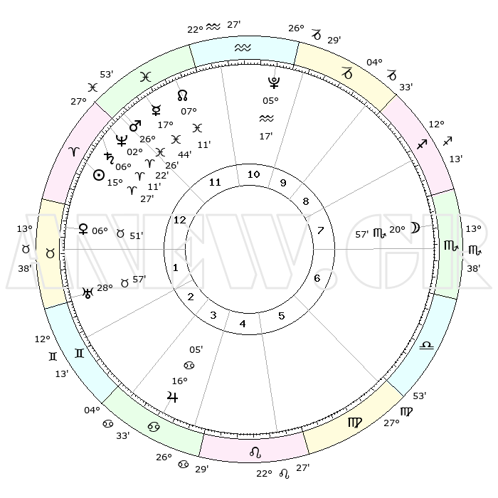 | | ΘΕΣΕΙΣ ΠΛΑΝΗΤΩΝ ΑΣΤΡΟΛΟΓΙΚΟΥ ΧΑΡΤΗ ΤΗΣ ΣΤΙΓΜΗΣ ΑΥΤΗΣ | | | | Πλανήτης | Ζώδιο | Μοίρες | Δεκαήμ. | Σε οίκο | Απόκλιση | | Ακμές των οίκων | | Ηλιος | Κριός | 15°12' | Δεύτερο | 3 | 05 N 59 | | 1ος | 08°17' | Αιγόκερως | | Σελήνη | Σκορπιός | 17°56' | Δεύτερο | 10 | 21 S 49 | | 2ος | 17°33' | Υδροχόος | | Ερμής | Ιχθείς | 17°28' | Δεύτερο | 2 | 06 S 39 | | 3ος | 27°51' | Ιχθείς | | Αφροδίτη | Ταύρος | 06°33' | Πρώτο | 4 | 13 N 26 | | 4ος | 00°21' | Ταύρος | | Αρης | Ιχθείς | 26°14' | Τρίτο | 2 | 02 S 26 | | 5ος | 25°26' | Ταύρος | | Δίας | Καρκίνος | 16°04' | Δεύτερο | 7 | 22 N 50 | | 6ος | 16°49' | Δίδυμοι | | Κρόνος | Κριός | 06°09' | Πρώτο | 3 | 00 N 29 | | 7ος | 08°17' | Καρκίνος | | Ουρανός | Ταύρος | 28°56' | Τρίτο | 5 | 19 N 45 | | 8ος | 17°33' | Λέων | | Ποσειδώνας | Κριός | 02°21' | Πρώτο | 3 | 00 S 16 | | 9ος | 27°51' | Παρθένος | | Πλούτωνας | Υδροχόος | 05°17' | Πρώτο | 1 | 22 S 47 | | 10ος | 00°21' | Σκορπιός | | Β. Δεσμός | Ιχθείς | 07°12' | Πρώτο | 2 | 08 S 52 | | 11ος | 25°26' | Σκορπιός | | Ωροσκόπος | Αιγόκερως | 08°17' | Πρώτο | | | 12ος | 16°49' | Τοξότης | | Μεσουράνημα | Σκορπιός | 00°21' | Πρώτο | | | |