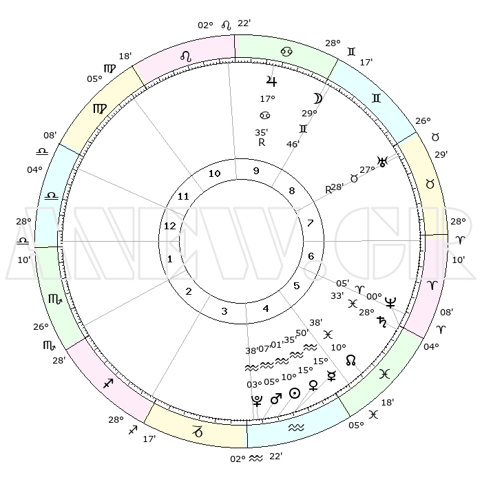 | | ΘΕΣΕΙΣ ΠΛΑΝΗΤΩΝ ΑΣΤΡΟΛΟΓΙΚΟΥ ΧΑΡΤΗ ΤΗΣ ΣΤΙΓΜΗΣ ΑΥΤΗΣ | | | | Πλανήτης | Ζώδιο | Μοίρες | Δεκαήμ. | Σε οίκο | Απόκλιση | | Ακμές των οίκων | | Ηλιος | Υδροχόος | 09°58' | Πρώτο | 4 | 17 S 45 | | 1ος | 11°17' | Ζυγός | | Σελήνη | Δίδυμοι | 28°55' | Τρίτο | 9 | 28 N 20 | | 2ος | 08°37' | Σκορπιός | | Ερμής | Υδροχόος | 15°44' | Δεύτερο | 5 | 18 S 01 | | 3ος | 09°30' | Τοξότης | | Αφροδίτη | Υδροχόος | 15°30' | Δεύτερο | 4 | 17 S 27 | | 4ος | 12°43' | Αιγόκερως | | Αρης | Υδροχόος | 05°04' | Πρώτο | 4 | 20 S 00 | | 5ος | 15°39' | Υδροχόος | | Δίας | Καρκίνος | 17°36'R | Δεύτερο | 10 | 22 N 34 | | 6ος | 15°36' | Ιχθείς | | Κρόνος | Ιχθείς | 28°33' | Τρίτο | 6 | 02 S 35 | | 7ος | 11°17' | Κριός | | Ουρανός | Ταύρος | 27°28'R | Τρίτο | 8 | 19 N 24 | | 8ος | 08°37' | Ταύρος | | Ποσειδώνας | Κριός | 00°05' | Πρώτο | 6 | 01 S 10 | | 9ος | 09°30' | Δίδυμοι | | Πλούτωνας | Υδροχόος | 03°38' | Πρώτο | 4 | 23 S 02 | | 10ος | 12°43' | Καρκίνος | | Β. Δεσμός | Ιχθείς | 10°38' | Δεύτερο | 5 | 07 S 35 | | 11ος | 15°39' | Λέων | | Ωροσκόπος | Ζυγός | 11°17' | Δεύτερο | | | 12ος | 15°36' | Παρθένος | | Μεσουράνημα | Καρκίνος | 12°43' | Δεύτερο | | | |