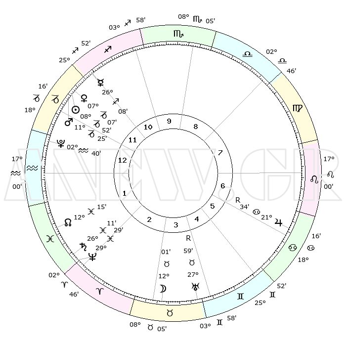 | | ΘΕΣΕΙΣ ΠΛΑΝΗΤΩΝ ΑΣΤΡΟΛΟΓΙΚΟΥ ΧΑΡΤΗ ΤΗΣ ΣΤΙΓΜΗΣ ΑΥΤΗΣ | | | | Πλανήτης | Ζώδιο | Μοίρες | Δεκαήμ. | Σε οίκο | Απόκλιση | | Ακμές των οίκων | | Ηλιος | Αιγόκερως | 08°48' | Πρώτο | 12 | 23 S 08 | | 1ος | 18°37' | Αιγόκερως | | Σελήνη | Ταύρος | 11°04' | Δεύτερο | 4 | 19 N 19 | | 2ος | 00°26' | Ιχθείς | | Ερμής | Τοξότης | 26°02' | Τρίτο | 12 | 23 S 45 | | 3ος | 10°18' | Κριός | | Αφροδίτη | Αιγόκερως | 07°02' | Πρώτο | 12 | 23 S 41 | | 4ος | 10°50' | Ταύρος | | Αρης | Αιγόκερως | 11°22' | Δεύτερο | 12 | 23 S 49 | | 5ος | 04°38' | Δίδυμοι | | Δίας | Καρκίνος | 21°35'R | Τρίτο | 7 | 21 N 56 | | 6ος | 25°50' | Δίδυμοι | | Κρόνος | Ιχθείς | 26°11' | Τρίτο | 2 | 03 S 36 | | 7ος | 18°37' | Καρκίνος | | Ουρανός | Ταύρος | 27°60'R | Τρίτο | 4 | 19 N 31 | | 8ος | 00°26' | Παρθένος | | Ποσειδώνας | Ιχθείς | 29°29' | Τρίτο | 2 | 01 S 26 | | 9ος | 10°18' | Ζυγός | | Πλούτωνας | Υδροχόος | 02°40' | Πρώτο | 1 | 23 S 14 | | 10ος | 10°50' | Σκορπιός | | Β. Δεσμός | Ιχθείς | 12°16' | Δεύτερο | 2 | 06 S 58 | | 11ος | 04°38' | Τοξότης | | Ωροσκόπος | Αιγόκερως | 18°37' | Δεύτερο | | | 12ος | 25°50' | Τοξότης | | Μεσουράνημα | Σκορπιός | 10°50' | Δεύτερο | | | |