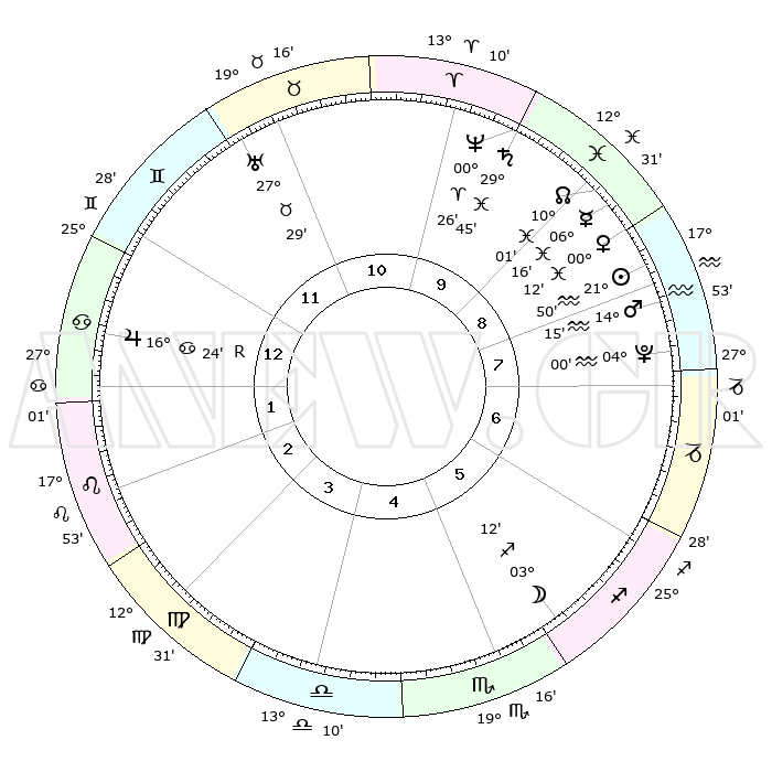 | | ΘΕΣΕΙΣ ΠΛΑΝΗΤΩΝ ΑΣΤΡΟΛΟΓΙΚΟΥ ΧΑΡΤΗ ΤΗΣ ΣΤΙΓΜΗΣ ΑΥΤΗΣ | | | | Πλανήτης | Ζώδιο | Μοίρες | Δεκαήμ. | Σε οίκο | Απόκλιση | | Ακμές των οίκων | | Ηλιος | Υδροχόος | 21°47' | Τρίτο | 8 | 14 S 14 | | 1ος | 12°25' | Καρκίνος | | Σελήνη | Τοξότης | 02°38' | Πρώτο | 5 | 25 S 48 | | 2ος | 02°50' | Λέων | | Ερμής | Ιχθείς | 06°11' | Πρώτο | 9 | 10 S 00 | | 3ος | 25°42' | Λέων | | Αφροδίτη | Ιχθείς | 00°08' | Πρώτο | 9 | 12 S 47 | | 4ος | 24°05' | Παρθένος | | Αρης | Υδροχόος | 14°13' | Δεύτερο | 8 | 17 S 35 | | 5ος | 29°36' | Ζυγός | | Δίας | Καρκίνος | 16°24'R | Δεύτερο | 1 | 22 N 45 | | 6ος | 08°12' | Τοξότης | | Κρόνος | Ιχθείς | 29°44' | Τρίτο | 10 | 02 S 05 | | 7ος | 12°25' | Αιγόκερως | | Ουρανός | Ταύρος | 27°29' | Τρίτο | 11 | 19 N 25 | | 8ος | 02°50' | Υδροχόος | | Ποσειδώνας | Κριός | 00°25' | Πρώτο | 10 | 01 S 02 | | 9ος | 25°42' | Υδροχόος | | Πλούτωνας | Υδροχόος | 03°60' | Πρώτο | 8 | 22 S 58 | | 10ος | 24°05' | Ιχθείς | | Β. Δεσμός | Ιχθείς | 10°01' | Δεύτερο | 9 | 07 S 48 | | 11ος | 29°36' | Κριός | | Ωροσκόπος | Καρκίνος | 12°25' | Δεύτερο | | | 12ος | 08°12' | Δίδυμοι | | Μεσουράνημα | Ιχθείς | 24°05' | Τρίτο | | | |