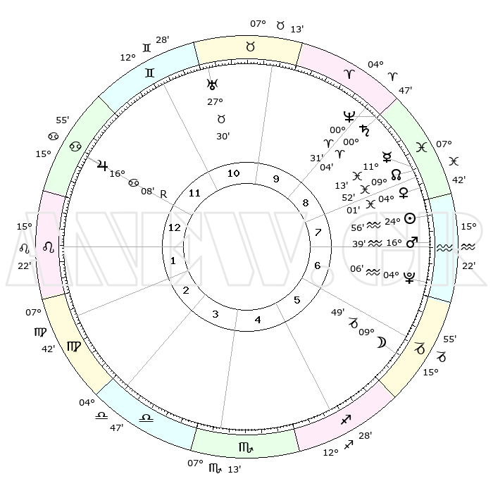 | | ΘΕΣΕΙΣ ΠΛΑΝΗΤΩΝ ΑΣΤΡΟΛΟΓΙΚΟΥ ΧΑΡΤΗ ΤΗΣ ΣΤΙΓΜΗΣ ΑΥΤΗΣ | | | | Πλανήτης | Ζώδιο | Μοίρες | Δεκαήμ. | Σε οίκο | Απόκλιση | | Ακμές των οίκων | | Ηλιος | Υδροχόος | 24°52' | Τρίτο | 8 | 13 S 14 | | 1ος | 26°34' | Καρκίνος | | Σελήνη | Αιγόκερως | 09°01' | Πρώτο | 6 | 27 S 40 | | 2ος | 17°24' | Λέων | | Ερμής | Ιχθείς | 11°07' | Δεύτερο | 8 | 07 S 38 | | 3ος | 11°59' | Παρθένος | | Αφροδίτη | Ιχθείς | 03°56' | Πρώτο | 8 | 11 S 26 | | 4ος | 12°34' | Ζυγός | | Αρης | Υδροχόος | 16°36' | Δεύτερο | 7 | 16 S 53 | | 5ος | 18°40' | Σκορπιός | | Δίας | Καρκίνος | 16°08'R | Δεύτερο | 12 | 22 N 47 | | 6ος | 24°57' | Τοξότης | | Κρόνος | Κριός | 00°04' | Πρώτο | 9 | 01 S 57 | | 7ος | 26°34' | Αιγόκερως | | Ουρανός | Ταύρος | 27°30' | Τρίτο | 11 | 19 N 25 | | 8ος | 17°24' | Υδροχόος | | Ποσειδώνας | Κριός | 00°31' | Πρώτο | 9 | 01 S 00 | | 9ος | 11°59' | Ιχθείς | | Πλούτωνας | Υδροχόος | 04°06' | Πρώτο | 7 | 22 S 57 | | 10ος | 12°34' | Κριός | | Β. Δεσμός | Ιχθείς | 09°52' | Πρώτο | 8 | 07 S 52 | | 11ος | 18°40' | Ταύρος | | Ωροσκόπος | Καρκίνος | 26°34' | Τρίτο | | | 12ος | 24°57' | Δίδυμοι | | Μεσουράνημα | Κριός | 12°34' | Δεύτερο | | | |