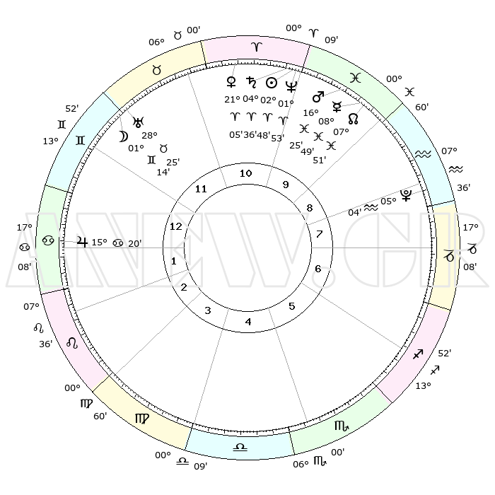 | | ΘΕΣΕΙΣ ΠΛΑΝΗΤΩΝ ΑΣΤΡΟΛΟΓΙΚΟΥ ΧΑΡΤΗ ΤΗΣ ΣΤΙΓΜΗΣ ΑΥΤΗΣ | | | | Πλανήτης | Ζώδιο | Μοίρες | Δεκαήμ. | Σε οίκο | Απόκλιση | | Ακμές των οίκων | | Ηλιος | Κριός | 02°44' | Πρώτο | 10 | 01 N 05 | | 1ος | 23°28' | Δίδυμοι | | Σελήνη | Δίδυμοι | 00°10' | Πρώτο | 12 | 25 N 14 | | 2ος | 14°46' | Καρκίνος | | Ερμής | Ιχθείς | 08°48' | Πρώτο | 10 | 07 S 55 | | 3ος | 06°13' | Λέων | | Αφροδίτη | Κριός | 20°59' | Τρίτο | 11 | 07 N 28 | | 4ος | 01°33' | Παρθένος | | Αρης | Ιχθείς | 16°21' | Δεύτερο | 10 | 06 S 22 | | 5ος | 04°22' | Ζυγός | | Δίας | Καρκίνος | 15°20' | Δεύτερο | 2 | 22 N 55 | | 6ος | 14°39' | Σκορπιός | | Κρόνος | Κριός | 04°35' | Πρώτο | 11 | 00 S 08 | | 7ος | 23°28' | Τοξότης | | Ουρανός | Ταύρος | 28°25' | Τρίτο | 12 | 19 N 38 | | 8ος | 14°46' | Αιγόκερως | | Ποσειδώνας | Κριός | 01°53' | Πρώτο | 10 | 00 S 27 | | 9ος | 06°13' | Υδροχόος | | Πλούτωνας | Υδροχόος | 05°04' | Πρώτο | 8 | 22 S 48 | | 10ος | 01°33' | Ιχθείς | | Β. Δεσμός | Ιχθείς | 07°52' | Πρώτο | 10 | 08 S 37 | | 11ος | 04°22' | Κριός | | Ωροσκόπος | Δίδυμοι | 23°28' | Τρίτο | | | 12ος | 14°39' | Ταύρος | | Μεσουράνημα | Ιχθείς | 01°33' | Πρώτο | | | |