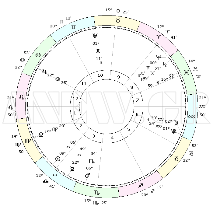 | ΘΕΣΕΙΣ ΠΛΑΝΗΤΩΝ ΑΣΤΡΟΛΟΓΙΚΟΥ ΧΑΡΤΗ ΤΗΣ ΣΤΙΓΜΗΣ ΑΥΤΗΣ | | Πλανήτης | Ζώδιο | Μοίρες | Δεκαήμ. | Σε οίκο | Απόκλιση | | Ακμές των οίκων | Ηλιος | Ζυγός | 09°01' | Πρώτο | 3 | 03 S 34 | | 1ος | 01°42' | Λέων | Σελήνη | Υδροχόος | 01°37' | Πρώτο | 6 | 23 S 31 | | 2ος | 22°51' | Λέων | Ερμής | Ζυγός | 22°42' | Τρίτο | 4 | 09 S 02 | | 3ος | 18°08' | Παρθένος | Αφροδίτη | Παρθένος | 15°15' | Δεύτερο | 2 | 07 N 01 | | 4ος | 19°23' | Ζυγός | Αρης | Σκορπιός | 06°31' | Πρώτο | 4 | 13 S 46 | | 5ος | 25°22' | Σκορπιός | Δίας | Καρκίνος | 22°35' | Τρίτο | 12 | 21 N 34 | | 6ος | 00°48' | Αιγόκερως | Κρόνος | Ιχθείς | 27°49'R | Τρίτο | 9 | 03 S 10 | | 7ος | 01°42' | Υδροχόος | Ουρανός | Δίδυμοι | 01°11'R | Πρώτο | 11 | 20 N 11 | | 8ος | 22°51' | Υδροχόος | Ποσειδώνας | Κριός | 00°31'R | Πρώτο | 9 | 01 S 03 | | 9ος | 18°08' | Ιχθείς | Πλούτωνας | Υδροχόος | 01°24'R | Πρώτο | 6 | 23 S 32 | | 10ος | 19°23' | Κριός | Β. Δεσμός | Ιχθείς | 16°59' | Δεύτερο | 8 | 05 S 08 | | 11ος | 25°22' | Ταύρος | Ωροσκόπος | Λέων | 01°42' | Πρώτο | | | 12ος | 00°48' | Καρκίνος | Μεσουράνημα | Κριός | 19°23' | Δεύτερο | | | |