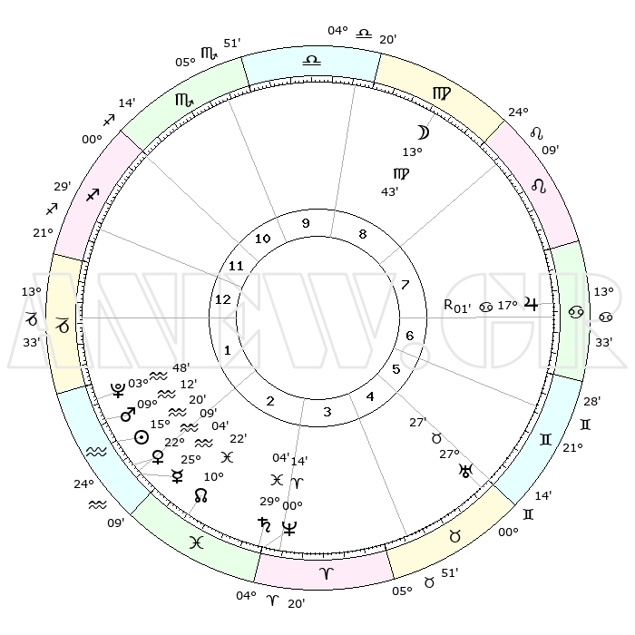 | | ΘΕΣΕΙΣ ΠΛΑΝΗΤΩΝ ΑΣΤΡΟΛΟΓΙΚΟΥ ΧΑΡΤΗ ΤΗΣ ΣΤΙΓΜΗΣ ΑΥΤΗΣ | | | | Πλανήτης | Ζώδιο | Μοίρες | Δεκαήμ. | Σε οίκο | Απόκλιση | | Ακμές των οίκων | | Ηλιος | Υδροχόος | 15°13' | Δεύτερο | 2 | 16 S 16 | | 1ος | 07°06' | Τοξότης | | Σελήνη | Παρθένος | 12°13' | Δεύτερο | 9 | 06 N 42 | | 2ος | 09°19' | Αιγόκερως | | Ερμής | Υδροχόος | 24°52' | Τρίτο | 3 | 14 S 47 | | 3ος | 16°14' | Υδροχόος | | Αφροδίτη | Υδροχόος | 22°00' | Τρίτο | 3 | 15 S 30 | | 4ος | 22°18' | Ιχθείς | | Αρης | Υδροχόος | 09°07' | Πρώτο | 2 | 18 S 59 | | 5ος | 22°21' | Κριός | | Δίας | Καρκίνος | 17°02'R | Δεύτερο | 8 | 22 N 39 | | 6ος | 16°28' | Ταύρος | | Κρόνος | Ιχθείς | 29°04' | Τρίτο | 4 | 02 S 22 | | 7ος | 07°06' | Δίδυμοι | | Ουρανός | Ταύρος | 27°27'R | Τρίτο | 6 | 19 N 24 | | 8ος | 09°19' | Καρκίνος | | Ποσειδώνας | Κριός | 00°14' | Πρώτο | 4 | 01 S 07 | | 9ος | 16°14' | Λέων | | Πλούτωνας | Υδροχόος | 03°48' | Πρώτο | 2 | 23 S 00 | | 10ος | 22°18' | Παρθένος | | Β. Δεσμός | Ιχθείς | 10°22' | Δεύτερο | 3 | 07 S 41 | | 11ος | 22°21' | Ζυγός | | Ωροσκόπος | Τοξότης | 07°06' | Πρώτο | | | 12ος | 16°28' | Σκορπιός | | Μεσουράνημα | Παρθένος | 22°18' | Τρίτο | | | |