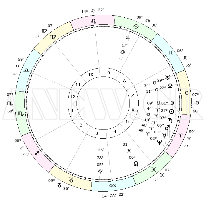 | | ΘΕΣΕΙΣ ΠΛΑΝΗΤΩΝ ΑΣΤΡΟΛΟΓΙΚΟΥ ΧΑΡΤΗ ΤΗΣ ΣΤΙΓΜΗΣ ΑΥΤΗΣ | | | | Πλανήτης | Ζώδιο | Μοίρες | Δεκαήμ. | Σε οίκο | Απόκλιση | | Ακμές των οίκων | | Ηλιος | Κριός | 27°41' | Τρίτο | 7 | 10 N 39 | | 1ος | 21°00' | Ζυγός | | Σελήνη | Ταύρος | 00°17' | Πρώτο | 7 | 15 N 22 | | 2ος | 18°54' | Σκορπιός | | Ερμής | Κριός | 03°41' | Πρώτο | 6 | 00 S 57 | | 3ος | 20°15' | Τοξότης | | Αφροδίτη | Ταύρος | 22°06' | Τρίτο | 8 | 18 N 35 | | 4ος | 23°54' | Αιγόκερως | | Αρης | Κριός | 06°07' | Πρώτο | 6 | 01 N 32 | | 5ος | 26°51' | Υδροχόος | | Δίας | Καρκίνος | 17°15' | Δεύτερο | 9 | 22 N 42 | | 6ος | 26°14' | Ιχθείς | | Κρόνος | Κριός | 07°42' | Πρώτο | 6 | 01 N 05 | | 7ος | 21°00' | Κριός | | Ουρανός | Ταύρος | 29°34' | Τρίτο | 8 | 19 N 53 | | 8ος | 18°54' | Ταύρος | | Ποσειδώνας | Κριός | 02°49' | Πρώτο | 6 | 00 S 05 | | 9ος | 20°15' | Δίδυμοι | | Πλούτωνας | Υδροχόος | 05°26' | Πρώτο | 4 | 22 S 47 | | 10ος | 23°54' | Καρκίνος | | Β. Δεσμός | Ιχθείς | 06°31' | Πρώτο | 5 | 09 S 07 | | 11ος | 26°51' | Λέων | | Ωροσκόπος | Ζυγός | 21°00' | Τρίτο | | | 12ος | 26°14' | Παρθένος | | Μεσουράνημα | Καρκίνος | 23°54' | Τρίτο | | | |