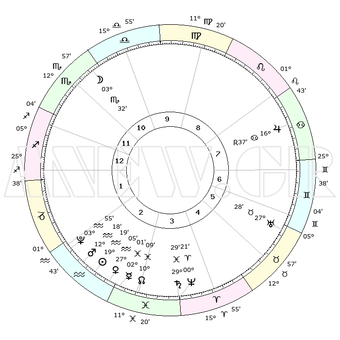 | | ΘΕΣΕΙΣ ΠΛΑΝΗΤΩΝ ΑΣΤΡΟΛΟΓΙΚΟΥ ΧΑΡΤΗ ΤΗΣ ΣΤΙΓΜΗΣ ΑΥΤΗΣ | | | | Πλανήτης | Ζώδιο | Μοίρες | Δεκαήμ. | Σε οίκο | Απόκλιση | | Ακμές των οίκων | | Ηλιος | Υδροχόος | 19°15' | Δεύτερο | 3 | 15 S 03 | | 1ος | 04°47' | Τοξότης | | Σελήνη | Σκορπιός | 02°42' | Πρώτο | 11 | 16 S 23 | | 2ος | 06°38' | Αιγόκερως | | Ερμής | Ιχθείς | 01°53' | Πρώτο | 3 | 11 S 55 | | 3ος | 13°08' | Υδροχόος | | Αφροδίτη | Υδροχόος | 26°60' | Τρίτο | 3 | 13 S 52 | | 4ος | 19°14' | Ιχθείς | | Αρης | Υδροχόος | 12°15' | Δεύτερο | 2 | 18 S 09 | | 5ος | 19°37' | Κριός | | Δίας | Καρκίνος | 16°38'R | Δεύτερο | 8 | 22 N 43 | | 6ος | 14°02' | Ταύρος | | Κρόνος | Ιχθείς | 29°28' | Τρίτο | 4 | 02 S 12 | | 7ος | 04°47' | Δίδυμοι | | Ουρανός | Ταύρος | 27°28' | Τρίτο | 6 | 19 N 24 | | 8ος | 06°38' | Καρκίνος | | Ποσειδώνας | Κριός | 00°21' | Πρώτο | 4 | 01 S 04 | | 9ος | 13°08' | Λέων | | Πλούτωνας | Υδροχόος | 03°55' | Πρώτο | 2 | 22 S 59 | | 10ος | 19°14' | Παρθένος | | Β. Δεσμός | Ιχθείς | 10°09' | Δεύτερο | 3 | 07 S 45 | | 11ος | 19°37' | Ζυγός | | Ωροσκόπος | Τοξότης | 04°47' | Πρώτο | | | 12ος | 14°02' | Σκορπιός | | Μεσουράνημα | Παρθένος | 19°14' | Δεύτερο | | | |