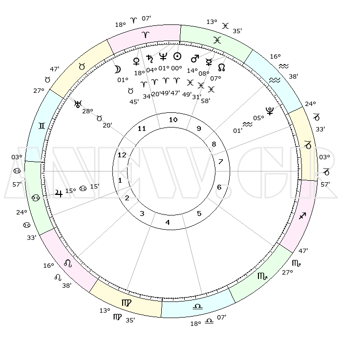 | | ΘΕΣΕΙΣ ΠΛΑΝΗΤΩΝ ΑΣΤΡΟΛΟΓΙΚΟΥ ΧΑΡΤΗ ΤΗΣ ΣΤΙΓΜΗΣ ΑΥΤΗΣ | | | | Πλανήτης | Ζώδιο | Μοίρες | Δεκαήμ. | Σε οίκο | Απόκλιση | | Ακμές των οίκων | | Ηλιος | Κριός | 00°43' | Πρώτο | 11 | 00 N 17 | | 1ος | 08°06' | Δίδυμοι | | Σελήνη | Ταύρος | 00°41' | Πρώτο | 12 | 15 N 34 | | 2ος | 01°25' | Καρκίνος | | Ερμής | Ιχθείς | 08°30' | Πρώτο | 10 | 07 S 35 | | 3ος | 22°39' | Καρκίνος | | Αφροδίτη | Κριός | 18°28' | Δεύτερο | 11 | 06 N 27 | | 4ος | 16°06' | Λέων | | Αρης | Ιχθείς | 14°45' | Δεύτερο | 10 | 07 S 00 | | 5ος | 16°01' | Παρθένος | | Δίας | Καρκίνος | 15°15' | Δεύτερο | 2 | 22 N 55 | | 6ος | 25°33' | Ζυγός | | Κρόνος | Κριός | 04°20' | Πρώτο | 11 | 00 S 14 | | 7ος | 08°06' | Τοξότης | | Ουρανός | Ταύρος | 28°20' | Τρίτο | 12 | 19 N 37 | | 8ος | 01°25' | Αιγόκερως | | Ποσειδώνας | Κριός | 01°48' | Πρώτο | 11 | 00 S 29 | | 9ος | 22°39' | Αιγόκερως | | Πλούτωνας | Υδροχόος | 05°01' | Πρώτο | 9 | 22 S 48 | | 10ος | 16°06' | Υδροχόος | | Β. Δεσμός | Ιχθείς | 07°58' | Πρώτο | 10 | 08 S 35 | | 11ος | 16°01' | Ιχθείς | | Ωροσκόπος | Δίδυμοι | 08°06' | Πρώτο | | | 12ος | 25°33' | Κριός | | Μεσουράνημα | Υδροχόος | 16°06' | Δεύτερο | | | |