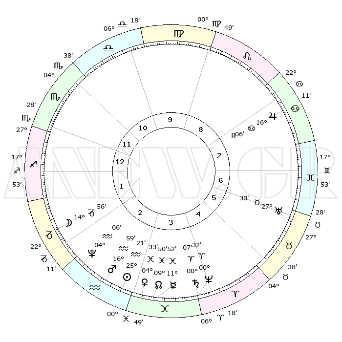 | | ΘΕΣΕΙΣ ΠΛΑΝΗΤΩΝ ΑΣΤΡΟΛΟΓΙΚΟΥ ΧΑΡΤΗ ΤΗΣ ΣΤΙΓΜΗΣ ΑΥΤΗΣ | | | | Πλανήτης | Ζώδιο | Μοίρες | Δεκαήμ. | Σε οίκο | Απόκλιση | | Ακμές των οίκων | | Ηλιος | Υδροχόος | 25°17' | Τρίτο | 3 | 13 S 06 | | 1ος | 26°46' | Σκορπιός | | Σελήνη | Αιγόκερως | 14°04' | Δεύτερο | 2 | 26 S 59 | | 2ος | 27°28' | Τοξότης | | Ερμής | Ιχθείς | 11°45' | Δεύτερο | 4 | 07 S 19 | | 3ος | 02°39' | Υδροχόος | | Αφροδίτη | Ιχθείς | 04°27' | Πρώτο | 3 | 11 S 14 | | 4ος | 08°36' | Ιχθείς | | Αρης | Υδροχόος | 16°55' | Δεύτερο | 3 | 16 S 47 | | 5ος | 10°01' | Κριός | | Δίας | Καρκίνος | 16°06'R | Δεύτερο | 8 | 22 N 47 | | 6ος | 05°30' | Ταύρος | | Κρόνος | Κριός | 00°07' | Πρώτο | 4 | 01 S 56 | | 7ος | 26°46' | Ταύρος | | Ουρανός | Ταύρος | 27°30' | Τρίτο | 7 | 19 N 25 | | 8ος | 27°28' | Δίδυμοι | | Ποσειδώνας | Κριός | 00°32' | Πρώτο | 4 | 00 S 59 | | 9ος | 02°39' | Λέων | | Πλούτωνας | Υδροχόος | 04°06' | Πρώτο | 3 | 22 S 57 | | 10ος | 08°36' | Παρθένος | | Β. Δεσμός | Ιχθείς | 09°50' | Πρώτο | 4 | 07 S 53 | | 11ος | 10°01' | Ζυγός | | Ωροσκόπος | Σκορπιός | 26°46' | Τρίτο | | | 12ος | 05°30' | Σκορπιός | | Μεσουράνημα | Παρθένος | 08°36' | Πρώτο | | | |