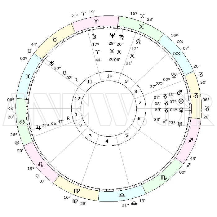 | | ΘΕΣΕΙΣ ΠΛΑΝΗΤΩΝ ΑΣΤΡΟΛΟΓΙΚΟΥ ΧΑΡΤΗ ΤΗΣ ΣΤΙΓΜΗΣ ΑΥΤΗΣ | | | | Πλανήτης | Ζώδιο | Μοίρες | Δεκαήμ. | Σε οίκο | Απόκλιση | | Ακμές των οίκων | | Ηλιος | Αιγόκερως | 07°03' | Πρώτο | 8 | 23 S 15 | | 1ος | 09°23' | Δίδυμοι | | Σελήνη | Κριός | 16°39' | Δεύτερο | 11 | 09 N 16 | | 2ος | 02°29' | Καρκίνος | | Ερμής | Τοξότης | 23°26' | Τρίτο | 7 | 23 S 27 | | 3ος | 23°42' | Καρκίνος | | Αφροδίτη | Αιγόκερως | 04°53' | Πρώτο | 8 | 23 S 43 | | 4ος | 17°17' | Λέων | | Αρης | Αιγόκερως | 10°04' | Δεύτερο | 8 | 23 S 55 | | 5ος | 17°26' | Παρθένος | | Δίας | Καρκίνος | 21°48'R | Τρίτο | 2 | 21 N 54 | | 6ος | 27°07' | Ζυγός | | Κρόνος | Ιχθείς | 26°06' | Τρίτο | 11 | 03 S 38 | | 7ος | 09°23' | Τοξότης | | Ουρανός | Ταύρος | 28°03'R | Τρίτο | 12 | 19 N 31 | | 8ος | 02°29' | Αιγόκερως | | Ποσειδώνας | Ιχθείς | 29°28' | Τρίτο | 11 | 01 S 26 | | 9ος | 23°42' | Αιγόκερως | | Πλούτωνας | Υδροχόος | 02°37' | Πρώτο | 9 | 23 S 14 | | 10ος | 17°17' | Υδροχόος | | Β. Δεσμός | Ιχθείς | 12°21' | Δεύτερο | 10 | 06 S 56 | | 11ος | 17°26' | Ιχθείς | | Ωροσκόπος | Δίδυμοι | 09°23' | Πρώτο | | | 12ος | 27°07' | Κριός | | Μεσουράνημα | Υδροχόος | 17°17' | Δεύτερο | | | |