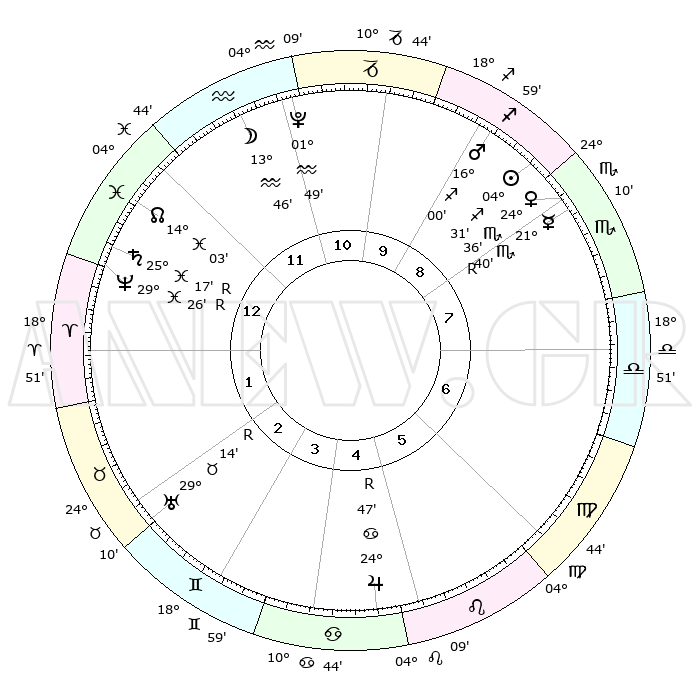 | | ΘΕΣΕΙΣ ΠΛΑΝΗΤΩΝ ΑΣΤΡΟΛΟΓΙΚΟΥ ΧΑΡΤΗ ΤΗΣ ΣΤΙΓΜΗΣ ΑΥΤΗΣ | | | | Πλανήτης | Ζώδιο | Μοίρες | Δεκαήμ. | Σε οίκο | Απόκλιση | | Ακμές των οίκων | | Ηλιος | Τοξότης | 04°30' | Πρώτο | 8 | 21 S 02 | | 1ος | 11°14' | Κριός | | Σελήνη | Υδροχόος | 13°36' | Δεύτερο | 11 | 19 S 13 | | 2ος | 18°39' | Ταύρος | | Ερμής | Σκορπιός | 21°41'R | Τρίτο | 8 | 16 S 04 | | 3ος | 14°26' | Δίδυμοι | | Αφροδίτη | Σκορπιός | 24°35' | Τρίτο | 8 | 18 S 04 | | 4ος | 06°20' | Καρκίνος | | Αρης | Τοξότης | 15°60' | Δεύτερο | 9 | 23 S 19 | | 5ος | 29°14' | Καρκίνος | | Δίας | Καρκίνος | 24°47'R | Τρίτο | 4 | 21 N 19 | | 6ος | 28°28' | Λέων | | Κρόνος | Ιχθείς | 25°17'R | Τρίτο | 12 | 04 S 04 | | 7ος | 11°14' | Ζυγός | | Ουρανός | Ταύρος | 29°14'R | Τρίτο | 2 | 19 N 47 | | 8ος | 18°39' | Σκορπιός | | Ποσειδώνας | Ιχθείς | 29°26'R | Τρίτο | 12 | 01 S 28 | | 9ος | 14°26' | Τοξότης | | Πλούτωνας | Υδροχόος | 01°49' | Πρώτο | 11 | 23 S 25 | | 10ος | 06°20' | Αιγόκερως | | Β. Δεσμός | Ιχθείς | 14°03' | Δεύτερο | 12 | 06 S 17 | | 11ος | 29°14' | Αιγόκερως | | Ωροσκόπος | Κριός | 11°14' | Δεύτερο | | | 12ος | 28°28' | Υδροχόος | | Μεσουράνημα | Αιγόκερως | 06°20' | Πρώτο | | | |