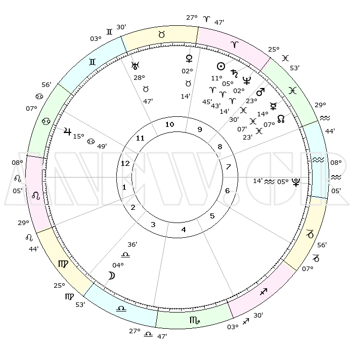 | | ΘΕΣΕΙΣ ΠΛΑΝΗΤΩΝ ΑΣΤΡΟΛΟΓΙΚΟΥ ΧΑΡΤΗ ΤΗΣ ΣΤΙΓΜΗΣ ΑΥΤΗΣ | | | | Πλανήτης | Ζώδιο | Μοίρες | Δεκαήμ. | Σε οίκο | Απόκλιση | | Ακμές των οίκων | | Ηλιος | Κριός | 11°42' | Δεύτερο | 10 | 04 N 37 | | 1ος | 19°18' | Καρκίνος | | Σελήνη | Ζυγός | 03°47' | Πρώτο | 4 | 03 S 32 | | 2ος | 09°49' | Λέων | | Ερμής | Ιχθείς | 14°03' | Δεύτερο | 9 | 07 S 32 | | 3ος | 03°29' | Παρθένος | | Αφροδίτη | Ταύρος | 02°10' | Πρώτο | 10 | 11 N 49 | | 4ος | 02°59' | Ζυγός | | Αρης | Ιχθείς | 23°27' | Τρίτο | 9 | 03 S 33 | | 5ος | 08°57' | Σκορπιός | | Δίας | Καρκίνος | 15°48' | Δεύτερο | 12 | 22 N 52 | | 6ος | 16°27' | Τοξότης | | Κρόνος | Κριός | 05°43' | Πρώτο | 10 | 00 N 19 | | 7ος | 19°18' | Αιγόκερως | | Ουρανός | Ταύρος | 28°47' | Τρίτο | 11 | 19 N 43 | | 8ος | 09°49' | Υδροχόος | | Ποσειδώνας | Κριός | 02°14' | Πρώτο | 9 | 00 S 19 | | 9ος | 03°29' | Ιχθείς | | Πλούτωνας | Υδροχόος | 05°13' | Πρώτο | 7 | 22 S 47 | | 10ος | 02°59' | Κριός | | Β. Δεσμός | Ιχθείς | 07°23' | Πρώτο | 9 | 08 S 48 | | 11ος | 08°57' | Ταύρος | | Ωροσκόπος | Καρκίνος | 19°18' | Δεύτερο | | | 12ος | 16°27' | Δίδυμοι | | Μεσουράνημα | Κριός | 02°59' | Πρώτο | | | |
