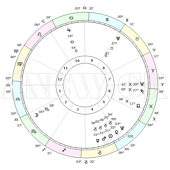 | | ΘΕΣΕΙΣ ΠΛΑΝΗΤΩΝ ΑΣΤΡΟΛΟΓΙΚΟΥ ΧΑΡΤΗ ΤΗΣ ΣΤΙΓΜΗΣ ΑΥΤΗΣ | | | | Πλανήτης | Ζώδιο | Μοίρες | Δεκαήμ. | Σε οίκο | Απόκλιση | | Ακμές των οίκων | | Ηλιος | Αιγόκερως | 21°28' | Τρίτο | 6 | 21 S 43 | | 1ος | 04°08' | Λέων | | Σελήνη | Σκορπιός | 02°44' | Πρώτο | 4 | 16 S 14 | | 2ος | 25°28' | Λέων | | Ερμής | Αιγόκερως | 15°19' | Δεύτερο | 6 | 24 S 07 | | 3ος | 21°05' | Παρθένος | | Αφροδίτη | Αιγόκερως | 22°39' | Τρίτο | 6 | 22 S 24 | | 4ος | 22°36' | Ζυγός | | Αρης | Αιγόκερως | 20°55' | Τρίτο | 6 | 22 S 45 | | 5ος | 28°31' | Σκορπιός | | Δίας | Καρκίνος | 19°55'R | Δεύτερο | 12 | 22 N 13 | | 6ος | 03°33' | Αιγόκερως | | Κρόνος | Ιχθείς | 26°60' | Τρίτο | 9 | 03 S 14 | | 7ος | 04°08' | Υδροχόος | | Ουρανός | Ταύρος | 27°41'R | Τρίτο | 10 | 19 N 27 | | 8ος | 25°28' | Υδροχόος | | Ποσειδώνας | Ιχθείς | 29°40' | Τρίτο | 9 | 01 S 21 | | 9ος | 21°05' | Ιχθείς | | Πλούτωνας | Υδροχόος | 03°03' | Πρώτο | 6 | 23 S 09 | | 10ος | 22°36' | Κριός | | Β. Δεσμός | Ιχθείς | 11°36' | Δεύτερο | 8 | 07 S 13 | | 11ος | 28°31' | Ταύρος | | Ωροσκόπος | Λέων | 04°08' | Πρώτο | | | 12ος | 03°33' | Καρκίνος | | Μεσουράνημα | Κριός | 22°36' | Τρίτο | | | |
