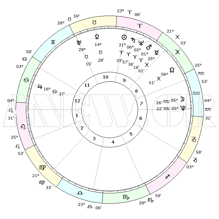 | | ΘΕΣΕΙΣ ΠΛΑΝΗΤΩΝ ΑΣΤΡΟΛΟΓΙΚΟΥ ΧΑΡΤΗ ΤΗΣ ΣΤΙΓΜΗΣ ΑΥΤΗΣ | | | | Πλανήτης | Ζώδιο | Μοίρες | Δεκαήμ. | Σε οίκο | Απόκλιση | | Ακμές των οίκων | | Ηλιος | Κριός | 21°29' | Τρίτο | 10 | 08 N 23 | | 1ος | 14°06' | Καρκίνος | | Σελήνη | Υδροχόος | 04°35' | Πρώτο | 8 | 21 S 53 | | 2ος | 04°32' | Λέων | | Ερμής | Ιχθείς | 24°56' | Τρίτο | 9 | 04 S 15 | | 3ος | 27°35' | Λέων | | Αφροδίτη | Ταύρος | 14°23' | Δεύτερο | 11 | 16 N 09 | | 4ος | 26°15' | Παρθένος | | Αρης | Κριός | 01°13' | Πρώτο | 10 | 00 S 26 | | 5ος | 01°54' | Σκορπιός | | Δίας | Καρκίνος | 16°36' | Δεύτερο | 1 | 22 N 47 | | 6ος | 10°14' | Τοξότης | | Κρόνος | Κριός | 06°57' | Πρώτο | 10 | 00 N 47 | | 7ος | 14°06' | Αιγόκερως | | Ουρανός | Ταύρος | 29°15' | Τρίτο | 11 | 19 N 49 | | 8ος | 04°32' | Υδροχόος | | Ποσειδώνας | Κριός | 02°36' | Πρώτο | 10 | 00 S 10 | | 9ος | 27°35' | Υδροχόος | | Πλούτωνας | Υδροχόος | 05°22' | Πρώτο | 8 | 22 S 47 | | 10ος | 26°15' | Ιχθείς | | Β. Δεσμός | Ιχθείς | 06°51' | Πρώτο | 9 | 09 S 00 | | 11ος | 01°54' | Ταύρος | | Ωροσκόπος | Καρκίνος | 14°06' | Δεύτερο | | | 12ος | 10°14' | Δίδυμοι | | Μεσουράνημα | Ιχθείς | 26°15' | Τρίτο | | | |