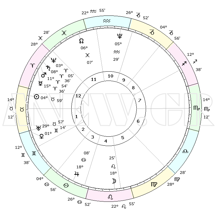 | | ΘΕΣΕΙΣ ΠΛΑΝΗΤΩΝ ΑΣΤΡΟΛΟΓΙΚΟΥ ΧΑΡΤΗ ΤΗΣ ΣΤΙΓΜΗΣ ΑΥΤΗΣ | | | | Πλανήτης | Ζώδιο | Μοίρες | Δεκαήμ. | Σε οίκο | Απόκλιση | | Ακμές των οίκων | | Ηλιος | Ταύρος | 04°55' | Πρώτο | 1 | 13 N 09 | | 1ος | 07°29' | Κριός | | Σελήνη | Λέων | 17°31' | Δεύτερο | 5 | 17 N 14 | | 2ος | 15°54' | Ταύρος | | Ερμής | Κριός | 15°29' | Δεύτερο | 1 | 03 N 51 | | 3ος | 12°12' | Δίδυμοι | | Αφροδίτη | Δίδυμοι | 01°09' | Πρώτο | 2 | 21 N 00 | | 4ος | 04°13' | Καρκίνος | | Αρης | Κριός | 11°51' | Δεύτερο | 1 | 03 N 50 | | 5ος | 26°53' | Καρκίνος | | Δίας | Καρκίνος | 18°08' | Δεύτερο | 4 | 22 N 35 | | 6ος | 25°29' | Λέων | | Κρόνος | Κριός | 08°35' | Πρώτο | 1 | 01 N 25 | | 7ος | 07°29' | Ζυγός | | Ουρανός | Ταύρος | 29°57' | Τρίτο | 2 | 19 N 58 | | 8ος | 15°54' | Σκορπιός | | Ποσειδώνας | Κριός | 03°04' | Πρώτο | 12 | 00 N 01 | | 9ος | 12°12' | Τοξότης | | Πλούτωνας | Υδροχόος | 05°29' | Πρώτο | 11 | 22 S 48 | | 10ος | 04°13' | Αιγόκερως | | Β. Δεσμός | Ιχθείς | 06°08' | Πρώτο | 12 | 09 S 16 | | 11ος | 26°53' | Αιγόκερως | | Ωροσκόπος | Κριός | 07°29' | Πρώτο | | | 12ος | 25°29' | Υδροχόος | | Μεσουράνημα | Αιγόκερως | 04°13' | Πρώτο | | | |