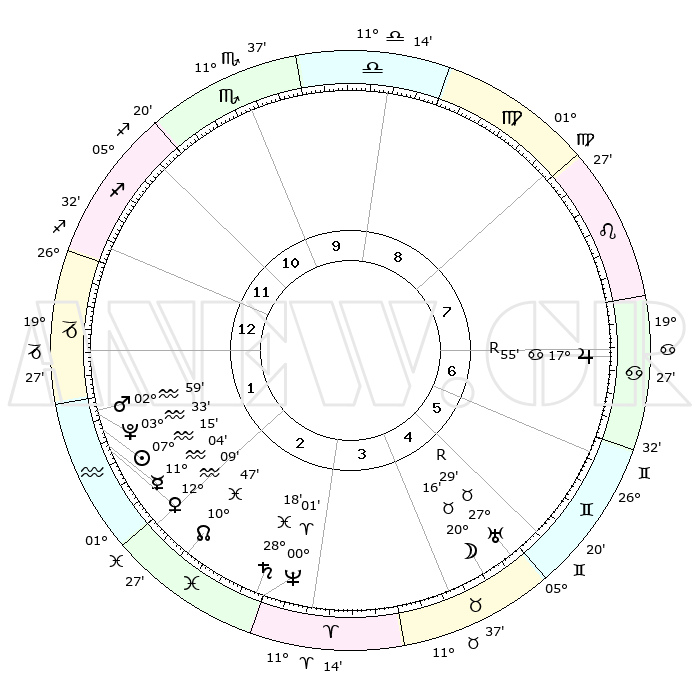 | | ΘΕΣΕΙΣ ΠΛΑΝΗΤΩΝ ΑΣΤΡΟΛΟΓΙΚΟΥ ΧΑΡΤΗ ΤΗΣ ΣΤΙΓΜΗΣ ΑΥΤΗΣ | | | | Πλανήτης | Ζώδιο | Μοίρες | Δεκαήμ. | Σε οίκο | Απόκλιση | | Ακμές των οίκων | | Ηλιος | Υδροχόος | 07°11' | Πρώτο | 2 | 18 S 28 | | 1ος | 27°10' | Τοξότης | | Σελήνη | Ταύρος | 19°22' | Δεύτερο | 5 | 22 N 16 | | 2ος | 03°37' | Υδροχόος | | Ερμής | Υδροχόος | 10°57' | Δεύτερο | 2 | 19 S 28 | | 3ος | 13°23' | Ιχθείς | | Αφροδίτη | Υδροχόος | 12°04' | Δεύτερο | 2 | 18 S 24 | | 4ος | 17°46' | Κριός | | Αρης | Υδροχόος | 02°56' | Πρώτο | 1 | 20 S 30 | | 5ος | 14°32' | Ταύρος | | Δίας | Καρκίνος | 17°55'R | Δεύτερο | 7 | 22 N 32 | | 6ος | 06°32' | Δίδυμοι | | Κρόνος | Ιχθείς | 28°17' | Τρίτο | 3 | 02 S 41 | | 7ος | 27°10' | Δίδυμοι | | Ουρανός | Ταύρος | 27°29'R | Τρίτο | 5 | 19 N 24 | | 8ος | 03°37' | Λέων | | Ποσειδώνας | Κριός | 00°01' | Πρώτο | 3 | 01 S 12 | | 9ος | 13°23' | Παρθένος | | Πλούτωνας | Υδροχόος | 03°33' | Πρώτο | 1 | 23 S 03 | | 10ος | 17°46' | Ζυγός | | Β. Δεσμός | Ιχθείς | 10°47' | Δεύτερο | 2 | 07 S 31 | | 11ος | 14°32' | Σκορπιός | | Ωροσκόπος | Τοξότης | 27°10' | Τρίτο | | | 12ος | 06°32' | Τοξότης | | Μεσουράνημα | Ζυγός | 17°46' | Δεύτερο | | | |