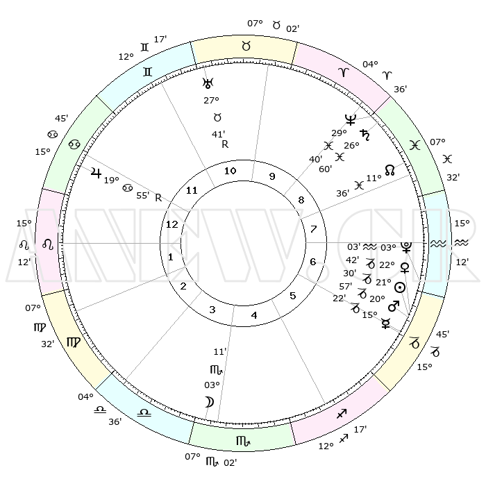 | | ΘΕΣΕΙΣ ΠΛΑΝΗΤΩΝ ΑΣΤΡΟΛΟΓΙΚΟΥ ΧΑΡΤΗ ΤΗΣ ΣΤΙΓΜΗΣ ΑΥΤΗΣ | | | | Πλανήτης | Ζώδιο | Μοίρες | Δεκαήμ. | Σε οίκο | Απόκλιση | | Ακμές των οίκων | | Ηλιος | Αιγόκερως | 21°10' | Τρίτο | 10 | 21 S 46 | | 1ος | 14°00' | Κριός | | Σελήνη | Ζυγός | 29°20' | Τρίτο | 7 | 14 S 51 | | 2ος | 20°40' | Ταύρος | | Ερμής | Αιγόκερως | 14°52' | Δεύτερο | 10 | 24 S 08 | | 3ος | 16°05' | Δίδυμοι | | Αφροδίτη | Αιγόκερως | 22°18' | Τρίτο | 10 | 22 S 27 | | 4ος | 07°55' | Καρκίνος | | Αρης | Αιγόκερως | 20°42' | Τρίτο | 10 | 22 S 47 | | 5ος | 01°00' | Λέων | | Δίας | Καρκίνος | 19°58'R | Δεύτερο | 4 | 22 N 13 | | 6ος | 00°43' | Παρθένος | | Κρόνος | Ιχθείς | 26°58' | Τρίτο | 12 | 03 S 15 | | 7ος | 14°00' | Ζυγός | | Ουρανός | Ταύρος | 27°42'R | Τρίτο | 2 | 19 N 27 | | 8ος | 20°40' | Σκορπιός | | Ποσειδώνας | Ιχθείς | 29°40' | Τρίτο | 12 | 01 S 21 | | 9ος | 16°05' | Τοξότης | | Πλούτωνας | Υδροχόος | 03°03' | Πρώτο | 11 | 23 S 09 | | 10ος | 07°55' | Αιγόκερως | | Β. Δεσμός | Ιχθείς | 11°37' | Δεύτερο | 12 | 07 S 12 | | 11ος | 01°00' | Υδροχόος | | Ωροσκόπος | Κριός | 14°00' | Δεύτερο | | | 12ος | 00°43' | Ιχθείς | | Μεσουράνημα | Αιγόκερως | 07°55' | Πρώτο | | | |