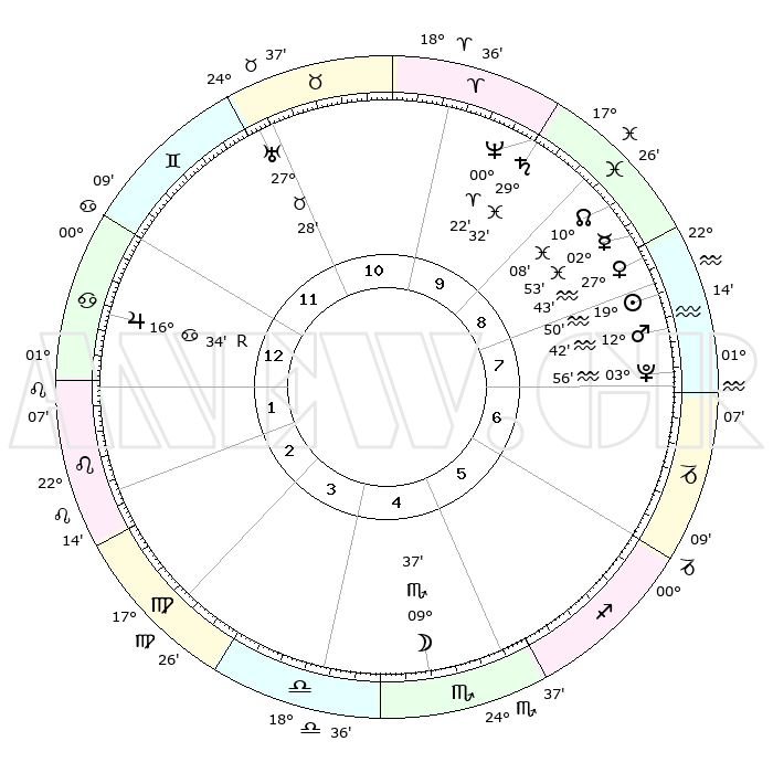 | | ΘΕΣΕΙΣ ΠΛΑΝΗΤΩΝ ΑΣΤΡΟΛΟΓΙΚΟΥ ΧΑΡΤΗ ΤΗΣ ΣΤΙΓΜΗΣ ΑΥΤΗΣ | | | | Πλανήτης | Ζώδιο | Μοίρες | Δεκαήμ. | Σε οίκο | Απόκλιση | | Ακμές των οίκων | | Ηλιος | Υδροχόος | 19°46' | Δεύτερο | 8 | 14 S 53 | | 1ος | 10°44' | Καρκίνος | | Σελήνη | Σκορπιός | 08°48' | Πρώτο | 5 | 18 S 43 | | 2ος | 01°09' | Λέων | | Ερμής | Ιχθείς | 02°46' | Πρώτο | 9 | 11 S 32 | | 3ος | 23°51' | Λέων | | Αφροδίτη | Υδροχόος | 27°38' | Τρίτο | 9 | 13 S 39 | | 4ος | 21°56' | Παρθένος | | Αρης | Υδροχόος | 12°38' | Δεύτερο | 8 | 18 S 02 | | 5ος | 27°18' | Ζυγός | | Δίας | Καρκίνος | 16°35'R | Δεύτερο | 1 | 22 N 43 | | 6ος | 06°08' | Τοξότης | | Κρόνος | Ιχθείς | 29°31' | Τρίτο | 10 | 02 S 10 | | 7ος | 10°44' | Αιγόκερως | | Ουρανός | Ταύρος | 27°28' | Τρίτο | 11 | 19 N 24 | | 8ος | 01°09' | Υδροχόος | | Ποσειδώνας | Κριός | 00°22' | Πρώτο | 10 | 01 S 04 | | 9ος | 23°51' | Υδροχόος | | Πλούτωνας | Υδροχόος | 03°56' | Πρώτο | 8 | 22 S 59 | | 10ος | 21°56' | Ιχθείς | | Β. Δεσμός | Ιχθείς | 10°08' | Δεύτερο | 9 | 07 S 46 | | 11ος | 27°18' | Κριός | | Ωροσκόπος | Καρκίνος | 10°44' | Δεύτερο | | | 12ος | 06°08' | Δίδυμοι | | Μεσουράνημα | Ιχθείς | 21°56' | Τρίτο | | | |
