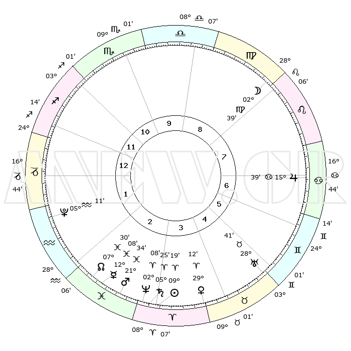 | | ΘΕΣΕΙΣ ΠΛΑΝΗΤΩΝ ΑΣΤΡΟΛΟΓΙΚΟΥ ΧΑΡΤΗ ΤΗΣ ΣΤΙΓΜΗΣ ΑΥΤΗΣ | | | | Πλανήτης | Ζώδιο | Μοίρες | Δεκαήμ. | Σε οίκο | Απόκλιση | | Ακμές των οίκων | | Ηλιος | Κριός | 09°14' | Πρώτο | 4 | 03 N 40 | | 1ος | 18°58' | Τοξότης | | Σελήνη | Παρθένος | 01°34' | Πρώτο | 8 | 11 N 32 | | 2ος | 23°29' | Αιγόκερως | | Ερμής | Ιχθείς | 12°05' | Δεύτερο | 3 | 07 S 55 | | 3ος | 02°17' | Ιχθείς | | Αφροδίτη | Κριός | 29°06' | Τρίτο | 4 | 10 N 40 | | 4ος | 07°40' | Κριός | | Αρης | Ιχθείς | 21°31' | Τρίτο | 3 | 04 S 20 | | 5ος | 05°49' | Ταύρος | | Δίας | Καρκίνος | 15°39' | Δεύτερο | 7 | 22 N 53 | | 6ος | 28°32' | Ταύρος | | Κρόνος | Κριός | 05°24' | Πρώτο | 3 | 00 N 12 | | 7ος | 18°58' | Δίδυμοι | | Ουρανός | Ταύρος | 28°40' | Τρίτο | 6 | 19 N 41 | | 8ος | 23°29' | Καρκίνος | | Ποσειδώνας | Κριός | 02°08' | Πρώτο | 3 | 00 S 21 | | 9ος | 02°17' | Παρθένος | | Πλούτωνας | Υδροχόος | 05°11' | Πρώτο | 2 | 22 S 48 | | 10ος | 07°40' | Ζυγός | | Β. Δεσμός | Ιχθείς | 07°31' | Πρώτο | 3 | 08 S 45 | | 11ος | 05°49' | Σκορπιός | | Ωροσκόπος | Τοξότης | 18°58' | Δεύτερο | | | 12ος | 28°32' | Σκορπιός | | Μεσουράνημα | Ζυγός | 07°40' | Πρώτο | | | |