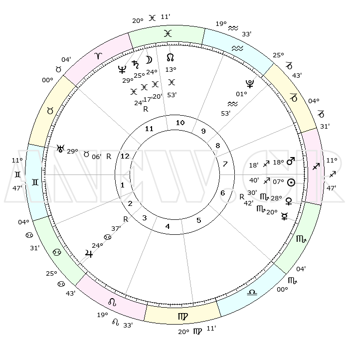 | | ΘΕΣΕΙΣ ΠΛΑΝΗΤΩΝ ΑΣΤΡΟΛΟΓΙΚΟΥ ΧΑΡΤΗ ΤΗΣ ΣΤΙΓΜΗΣ ΑΥΤΗΣ | | | | Πλανήτης | Ζώδιο | Μοίρες | Δεκαήμ. | Σε οίκο | Απόκλιση | | Ακμές των οίκων | | Ηλιος | Τοξότης | 07°38' | Πρώτο | 7 | 21 S 35 | | 1ος | 28°33' | Ταύρος | | Σελήνη | Ιχθείς | 23°54' | Τρίτο | 11 | 01 S 39 | | 2ος | 23°39' | Δίδυμοι | | Ερμής | Σκορπιός | 20°42'R | Τρίτο | 6 | 15 S 29 | | 3ος | 15°07' | Καρκίνος | | Αφροδίτη | Σκορπιός | 28°27' | Τρίτο | 6 | 19 S 04 | | 4ος | 07°47' | Λέων | | Αρης | Τοξότης | 18°16' | Δεύτερο | 7 | 23 S 34 | | 5ος | 05°60' | Παρθένος | | Δίας | Καρκίνος | 24°37'R | Τρίτο | 3 | 21 N 21 | | 6ος | 14°12' | Ζυγός | | Κρόνος | Ιχθείς | 25°17' | Τρίτο | 11 | 04 S 03 | | 7ος | 28°33' | Σκορπιός | | Ουρανός | Ταύρος | 29°06'R | Τρίτο | 1 | 19 N 45 | | 8ος | 23°39' | Τοξότης | | Ποσειδώνας | Ιχθείς | 29°24'R | Τρίτο | 11 | 01 S 29 | | 9ος | 15°07' | Αιγόκερως | | Πλούτωνας | Υδροχόος | 01°53' | Πρώτο | 9 | 23 S 24 | | 10ος | 07°47' | Υδροχόος | | Β. Δεσμός | Ιχθείς | 13°53' | Δεύτερο | 11 | 06 S 20 | | 11ος | 05°60' | Ιχθείς | | Ωροσκόπος | Ταύρος | 28°33' | Τρίτο | | | 12ος | 14°12' | Κριός | | Μεσουράνημα | Υδροχόος | 07°47' | Πρώτο | | | |