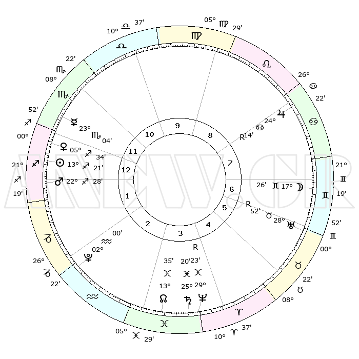 | | ΘΕΣΕΙΣ ΠΛΑΝΗΤΩΝ ΑΣΤΡΟΛΟΓΙΚΟΥ ΧΑΡΤΗ ΤΗΣ ΣΤΙΓΜΗΣ ΑΥΤΗΣ | | | | Πλανήτης | Ζώδιο | Μοίρες | Δεκαήμ. | Σε οίκο | Απόκλιση | | Ακμές των οίκων | | Ηλιος | Τοξότης | 13°19' | Δεύτερο | 1 | 22 S 24 | | 1ος | 11°43' | Τοξότης | | Σελήνη | Δίδυμοι | 16°57' | Δεύτερο | 7 | 27 N 45 | | 2ος | 14°45' | Αιγόκερως | | Ερμής | Σκορπιός | 23°02' | Τρίτο | 12 | 16 S 05 | | 3ος | 22°26' | Υδροχόος | | Αφροδίτη | Τοξότης | 05°31' | Πρώτο | 12 | 20 S 41 | | 4ος | 28°21' | Ιχθείς | | Αρης | Τοξότης | 22°27' | Τρίτο | 1 | 23 S 55 | | 5ος | 27°41' | Κριός | | Δίας | Καρκίνος | 24°14'R | Τρίτο | 8 | 21 N 26 | | 6ος | 21°13' | Ταύρος | | Κρόνος | Ιχθείς | 25°19' | Τρίτο | 3 | 04 S 01 | | 7ος | 11°43' | Δίδυμοι | | Ουρανός | Ταύρος | 28°52'R | Τρίτο | 6 | 19 N 42 | | 8ος | 14°45' | Καρκίνος | | Ποσειδώνας | Ιχθείς | 29°23'R | Τρίτο | 4 | 01 S 29 | | 9ος | 22°26' | Λέων | | Πλούτωνας | Υδροχόος | 02°00' | Πρώτο | 2 | 23 S 23 | | 10ος | 28°21' | Παρθένος | | Β. Δεσμός | Ιχθείς | 13°35' | Δεύτερο | 3 | 06 S 27 | | 11ος | 27°41' | Ζυγός | | Ωροσκόπος | Τοξότης | 11°43' | Δεύτερο | | | 12ος | 21°13' | Σκορπιός | | Μεσουράνημα | Παρθένος | 28°21' | Τρίτο | | | |