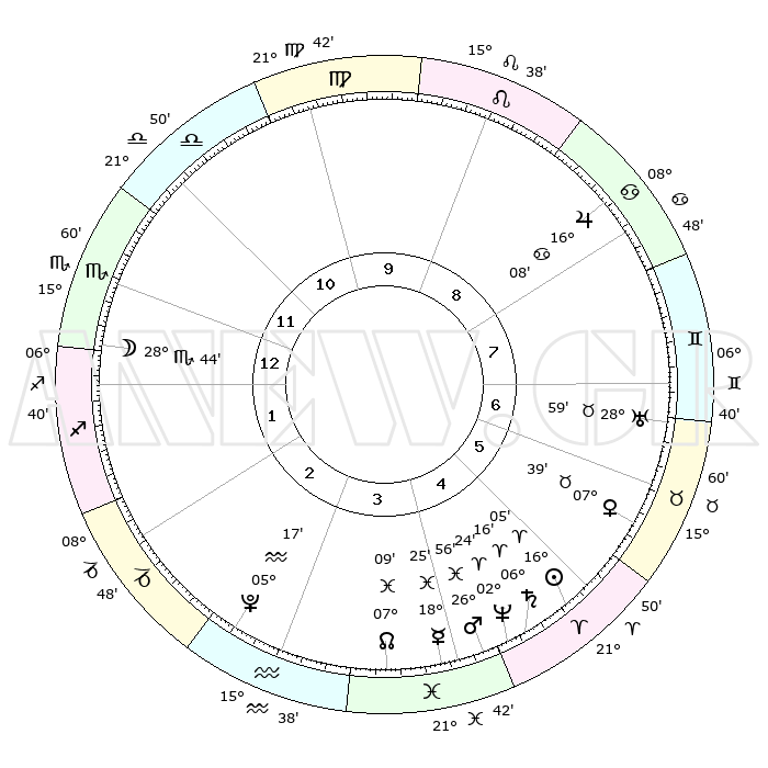 | | ΘΕΣΕΙΣ ΠΛΑΝΗΤΩΝ ΑΣΤΡΟΛΟΓΙΚΟΥ ΧΑΡΤΗ ΤΗΣ ΣΤΙΓΜΗΣ ΑΥΤΗΣ | | | | Πλανήτης | Ζώδιο | Μοίρες | Δεκαήμ. | Σε οίκο | Απόκλιση | | Ακμές των οίκων | | Ηλιος | Κριός | 16°01' | Δεύτερο | 5 | 06 N 18 | | 1ος | 15°60' | Σκορπιός | | Σελήνη | Σκορπιός | 27°53' | Τρίτο | 1 | 24 S 38 | | 2ος | 15°34' | Τοξότης | | Ερμής | Ιχθείς | 18°20' | Δεύτερο | 4 | 06 S 24 | | 3ος | 19°10' | Αιγόκερως | | Αφροδίτη | Ταύρος | 07°34' | Πρώτο | 6 | 13 N 48 | | 4ος | 24°31' | Υδροχόος | | Αρης | Ιχθείς | 26°53' | Τρίτο | 5 | 02 S 11 | | 5ος | 26°53' | Ιχθείς | | Δίας | Καρκίνος | 16°08' | Δεύτερο | 8 | 22 N 50 | | 6ος | 23°47' | Κριός | | Κρόνος | Κριός | 06°15' | Πρώτο | 5 | 00 N 32 | | 7ος | 15°60' | Ταύρος | | Ουρανός | Ταύρος | 28°59' | Τρίτο | 7 | 19 N 46 | | 8ος | 15°34' | Δίδυμοι | | Ποσειδώνας | Κριός | 02°23' | Πρώτο | 5 | 00 S 15 | | 9ος | 19°10' | Καρκίνος | | Πλούτωνας | Υδροχόος | 05°17' | Πρώτο | 3 | 22 S 47 | | 10ος | 24°31' | Λέων | | Β. Δεσμός | Ιχθείς | 07°09' | Πρώτο | 4 | 08 S 53 | | 11ος | 26°53' | Παρθένος | | Ωροσκόπος | Σκορπιός | 15°60' | Δεύτερο | | | 12ος | 23°47' | Ζυγός | | Μεσουράνημα | Λέων | 24°31' | Τρίτο | | | |