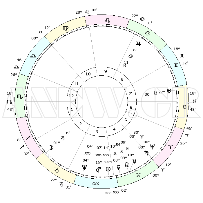| | ΘΕΣΕΙΣ ΠΛΑΝΗΤΩΝ ΑΣΤΡΟΛΟΓΙΚΟΥ ΧΑΡΤΗ ΤΗΣ ΣΤΙΓΜΗΣ ΑΥΤΗΣ | | | | Πλανήτης | Ζώδιο | Μοίρες | Δεκαήμ. | Σε οίκο | Απόκλιση | | Ακμές των οίκων | | Ηλιος | Υδροχόος | 24°10' | Τρίτο | 4 | 13 S 28 | | 1ος | 27°22' | Ζυγός | | Σελήνη | Αιγόκερως | 00°42' | Πρώτο | 3 | 28 S 19 | | 2ος | 25°38' | Σκορπιός | | Ερμής | Ιχθείς | 10°02' | Δεύτερο | 5 | 08 S 10 | | 3ος | 27°23' | Τοξότης | | Αφροδίτη | Ιχθείς | 03°05' | Πρώτο | 4 | 11 S 44 | | 4ος | 01°24' | Υδροχόος | | Αρης | Υδροχόος | 16°04' | Δεύτερο | 4 | 17 S 03 | | 5ος | 04°20' | Ιχθείς | | Δίας | Καρκίνος | 16°12'R | Δεύτερο | 9 | 22 N 46 | | 6ος | 03°15' | Κριός | | Κρόνος | Ιχθείς | 29°60' | Τρίτο | 5 | 01 S 59 | | 7ος | 27°22' | Κριός | | Ουρανός | Ταύρος | 27°30' | Τρίτο | 8 | 19 N 25 | | 8ος | 25°38' | Ταύρος | | Ποσειδώνας | Κριός | 00°30' | Πρώτο | 5 | 01 S 00 | | 9ος | 27°23' | Δίδυμοι | | Πλούτωνας | Υδροχόος | 04°04' | Πρώτο | 4 | 22 S 57 | | 10ος | 01°24' | Λέων | | Β. Δεσμός | Ιχθείς | 09°54' | Πρώτο | 5 | 07 S 51 | | 11ος | 04°20' | Παρθένος | | Ωροσκόπος | Ζυγός | 27°22' | Τρίτο | | | 12ος | 03°15' | Ζυγός | | Μεσουράνημα | Λέων | 01°24' | Πρώτο | | | |