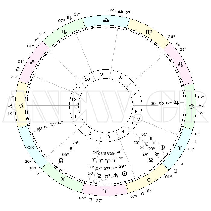 | | ΘΕΣΕΙΣ ΠΛΑΝΗΤΩΝ ΑΣΤΡΟΛΟΓΙΚΟΥ ΧΑΡΤΗ ΤΗΣ ΣΤΙΓΜΗΣ ΑΥΤΗΣ | | | | Πλανήτης | Ζώδιο | Μοίρες | Δεκαήμ. | Σε οίκο | Απόκλιση | | Ακμές των οίκων | | Ηλιος | Κριός | 29°50' | Τρίτο | 4 | 11 N 25 | | 1ος | 24°20' | Τοξότης | | Σελήνη | Δίδυμοι | 03°11' | Πρώτο | 5 | 25 N 46 | | 2ος | 00°06' | Υδροχόος | | Ερμής | Κριός | 07°02' | Πρώτο | 3 | 00 N 23 | | 3ος | 09°35' | Ιχθείς | | Αφροδίτη | Ταύρος | 24°48' | Τρίτο | 5 | 19 N 21 | | 4ος | 14°21' | Κριός | | Αρης | Κριός | 07°50' | Πρώτο | 3 | 02 N 14 | | 5ος | 11°35' | Ταύρος | | Δίας | Καρκίνος | 17°30' | Δεύτερο | 7 | 22 N 40 | | 6ος | 03°48' | Δίδυμοι | | Κρόνος | Κριός | 07°58' | Πρώτο | 3 | 01 N 11 | | 7ος | 24°20' | Δίδυμοι | | Ουρανός | Ταύρος | 29°41' | Τρίτο | 5 | 19 N 55 | | 8ος | 00°06' | Λέων | | Ποσειδώνας | Κριός | 02°54' | Πρώτο | 3 | 00 S 03 | | 9ος | 09°35' | Παρθένος | | Πλούτωνας | Υδροχόος | 05°27' | Πρώτο | 2 | 22 S 48 | | 10ος | 14°21' | Ζυγός | | Β. Δεσμός | Ιχθείς | 06°24' | Πρώτο | 2 | 09 S 10 | | 11ος | 11°35' | Σκορπιός | | Ωροσκόπος | Τοξότης | 24°20' | Τρίτο | | | 12ος | 03°48' | Τοξότης | | Μεσουράνημα | Ζυγός | 14°21' | Δεύτερο | | | |