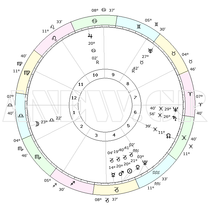 | | ΘΕΣΕΙΣ ΠΛΑΝΗΤΩΝ ΑΣΤΡΟΛΟΓΙΚΟΥ ΧΑΡΤΗ ΤΗΣ ΣΤΙΓΜΗΣ ΑΥΤΗΣ | | | | Πλανήτης | Ζώδιο | Μοίρες | Δεκαήμ. | Σε οίκο | Απόκλιση | | Ακμές των οίκων | | Ηλιος | Αιγόκερως | 19°56' | Δεύτερο | 1 | 21 S 57 | | 1ος | 02°58' | Αιγόκερως | | Σελήνη | Ζυγός | 14°45' | Δεύτερο | 9 | 08 S 29 | | 2ος | 10°52' | Υδροχόος | | Ερμής | Αιγόκερως | 12°57' | Δεύτερο | 1 | 24 S 15 | | 3ος | 21°02' | Ιχθείς | | Αφροδίτη | Αιγόκερως | 20°47' | Τρίτο | 1 | 22 S 39 | | 4ος | 24°29' | Κριός | | Αρης | Αιγόκερως | 19°46' | Δεύτερο | 1 | 22 S 55 | | 5ος | 20°21' | Ταύρος | | Δίας | Καρκίνος | 20°08'R | Τρίτο | 7 | 22 N 11 | | 6ος | 11°58' | Δίδυμοι | | Κρόνος | Ιχθείς | 26°53' | Τρίτο | 3 | 03 S 17 | | 7ος | 02°58' | Καρκίνος | | Ουρανός | Ταύρος | 27°43'R | Τρίτο | 5 | 19 N 27 | | 8ος | 10°52' | Λέων | | Ποσειδώνας | Ιχθείς | 29°39' | Τρίτο | 3 | 01 S 21 | | 9ος | 21°02' | Παρθένος | | Πλούτωνας | Υδροχόος | 03°00' | Πρώτο | 1 | 23 S 10 | | 10ος | 24°29' | Ζυγός | | Β. Δεσμός | Ιχθείς | 11°41' | Δεύτερο | 2 | 07 S 11 | | 11ος | 20°21' | Σκορπιός | | Ωροσκόπος | Αιγόκερως | 02°58' | Πρώτο | | | 12ος | 11°58' | Τοξότης | | Μεσουράνημα | Ζυγός | 24°29' | Τρίτο | | | |
