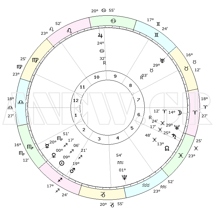 | | ΘΕΣΕΙΣ ΠΛΑΝΗΤΩΝ ΑΣΤΡΟΛΟΓΙΚΟΥ ΧΑΡΤΗ ΤΗΣ ΣΤΙΓΜΗΣ ΑΥΤΗΣ | | | | Πλανήτης | Ζώδιο | Μοίρες | Δεκαήμ. | Σε οίκο | Απόκλιση | | Ακμές των οίκων | | Ηλιος | Τοξότης | 09°03' | Πρώτο | 3 | 21 S 48 | | 1ος | 06°36' | Ζυγός | | Σελήνη | Κριός | 13°37' | Δεύτερο | 7 | 07 N 39 | | 2ος | 03°38' | Σκορπιός | | Ερμής | Σκορπιός | 20°51' | Τρίτο | 2 | 15 S 27 | | 3ος | 04°20' | Τοξότης | | Αφροδίτη | Τοξότης | 00°13' | Πρώτο | 2 | 19 S 30 | | 4ος | 07°25' | Αιγόκερως | | Αρης | Τοξότης | 19°19' | Δεύτερο | 3 | 23 S 40 | | 5ος | 10°21' | Υδροχόος | | Δίας | Καρκίνος | 24°32'R | Τρίτο | 10 | 21 N 22 | | 6ος | 10°31' | Ιχθείς | | Κρόνος | Ιχθείς | 25°17' | Τρίτο | 6 | 04 S 03 | | 7ος | 06°36' | Κριός | | Ουρανός | Ταύρος | 29°03'R | Τρίτο | 8 | 19 N 44 | | 8ος | 03°38' | Ταύρος | | Ποσειδώνας | Ιχθείς | 29°24'R | Τρίτο | 6 | 01 S 29 | | 9ος | 04°20' | Δίδυμοι | | Πλούτωνας | Υδροχόος | 01°54' | Πρώτο | 4 | 23 S 24 | | 10ος | 07°25' | Καρκίνος | | Β. Δεσμός | Ιχθείς | 13°49' | Δεύτερο | 6 | 06 S 22 | | 11ος | 10°21' | Λέων | | Ωροσκόπος | Ζυγός | 06°36' | Πρώτο | | | 12ος | 10°31' | Παρθένος | | Μεσουράνημα | Καρκίνος | 07°25' | Πρώτο | | | |