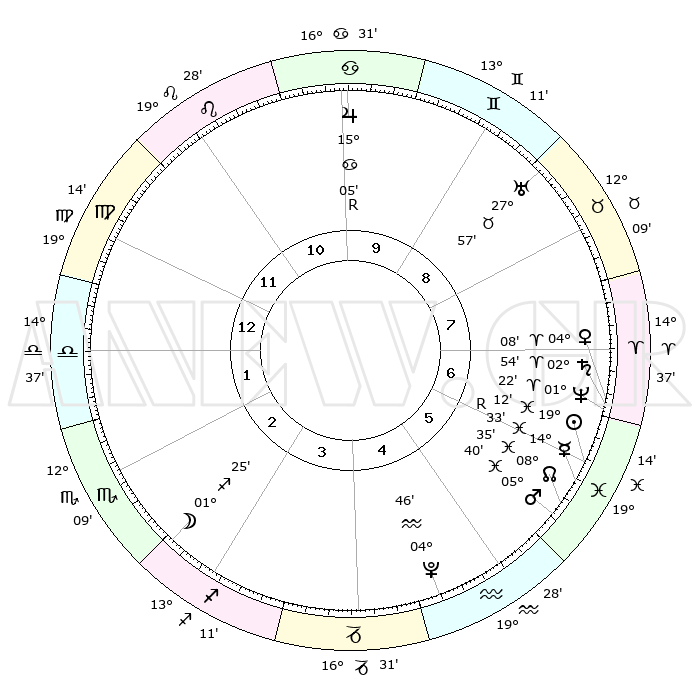 | | ΘΕΣΕΙΣ ΠΛΑΝΗΤΩΝ ΑΣΤΡΟΛΟΓΙΚΟΥ ΧΑΡΤΗ ΤΗΣ ΣΤΙΓΜΗΣ ΑΥΤΗΣ | | | | Πλανήτης | Ζώδιο | Μοίρες | Δεκαήμ. | Σε οίκο | Απόκλιση | | Ακμές των οίκων | | Ηλιος | Ιχθείς | 18°40' | Δεύτερο | 12 | 04 S 29 | | 1ος | 09°12' | Κριός | | Σελήνη | Σκορπιός | 25°04' | Τρίτο | 8 | 24 S 00 | | 2ος | 17°09' | Ταύρος | | Ερμής | Ιχθείς | 15°05'R | Δεύτερο | 12 | 02 S 40 | | 3ος | 13°13' | Δίδυμοι | | Αφροδίτη | Κριός | 03°29' | Πρώτο | 12 | 00 N 17 | | 4ος | 05°11' | Καρκίνος | | Αρης | Ιχθείς | 05°15' | Πρώτο | 12 | 10 S 36 | | 5ος | 27°57' | Καρκίνος | | Δίας | Καρκίνος | 15°05'R | Δεύτερο | 4 | 22 N 56 | | 6ος | 26°50' | Λέων | | Κρόνος | Κριός | 02°50' | Πρώτο | 12 | 00 S 50 | | 7ος | 09°12' | Ζυγός | | Ουρανός | Ταύρος | 27°56' | Τρίτο | 2 | 19 N 31 | | 8ος | 17°09' | Σκορπιός | | Ποσειδώνας | Κριός | 01°21' | Πρώτο | 12 | 00 S 40 | | 9ος | 13°13' | Τοξότης | | Πλούτωνας | Υδροχόος | 04°45' | Πρώτο | 11 | 22 S 51 | | 10ος | 05°11' | Αιγόκερως | | Β. Δεσμός | Ιχθείς | 08°37' | Πρώτο | 12 | 08 S 20 | | 11ος | 27°57' | Αιγόκερως | | Ωροσκόπος | Κριός | 09°12' | Πρώτο | | | 12ος | 26°50' | Υδροχόος | | Μεσουράνημα | Αιγόκερως | 05°11' | Πρώτο | | | |