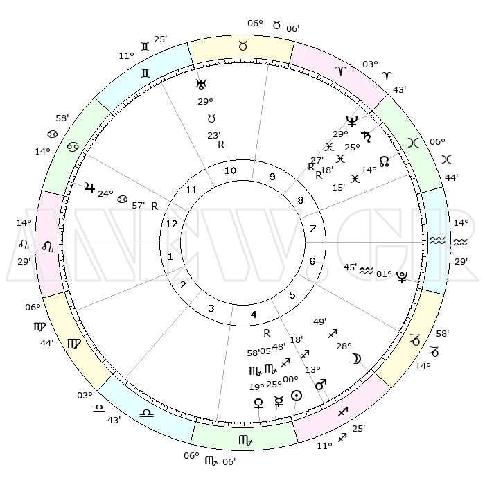 | | ΘΕΣΕΙΣ ΠΛΑΝΗΤΩΝ ΑΣΤΡΟΛΟΓΙΚΟΥ ΧΑΡΤΗ ΤΗΣ ΣΤΙΓΜΗΣ ΑΥΤΗΣ | | | | Πλανήτης | Ζώδιο | Μοίρες | Δεκαήμ. | Σε οίκο | Απόκλιση | | Ακμές των οίκων | | Ηλιος | Τοξότης | 00°45' | Πρώτο | 5 | 20 S 18 | | 1ος | 29°34' | Καρκίνος | | Σελήνη | Τοξότης | 28°12' | Τρίτο | 5 | 28 S 17 | | 2ος | 20°34' | Λέων | | Ερμής | Σκορπιός | 25°09'R | Τρίτο | 5 | 17 S 46 | | 3ος | 15°33' | Παρθένος | | Αφροδίτη | Σκορπιός | 19°54' | Δεύτερο | 4 | 16 S 46 | | 4ος | 16°32' | Ζυγός | | Αρης | Τοξότης | 13°15' | Δεύτερο | 5 | 22 S 58 | | 5ος | 22°36' | Σκορπιός | | Δίας | Καρκίνος | 24°57'R | Τρίτο | 12 | 21 N 16 | | 6ος | 28°22' | Τοξότης | | Κρόνος | Ιχθείς | 25°18'R | Τρίτο | 9 | 04 S 04 | | 7ος | 29°34' | Αιγόκερως | | Ουρανός | Ταύρος | 29°23'R | Τρίτο | 11 | 19 N 49 | | 8ος | 20°34' | Υδροχόος | | Ποσειδώνας | Ιχθείς | 29°28'R | Τρίτο | 9 | 01 S 28 | | 9ος | 15°33' | Ιχθείς | | Πλούτωνας | Υδροχόος | 01°44' | Πρώτο | 7 | 23 S 26 | | 10ος | 16°32' | Κριός | | Β. Δεσμός | Ιχθείς | 14°15' | Δεύτερο | 8 | 06 S 12 | | 11ος | 22°36' | Ταύρος | | Ωροσκόπος | Καρκίνος | 29°34' | Τρίτο | | | 12ος | 28°22' | Δίδυμοι | | Μεσουράνημα | Κριός | 16°32' | Δεύτερο | | | |