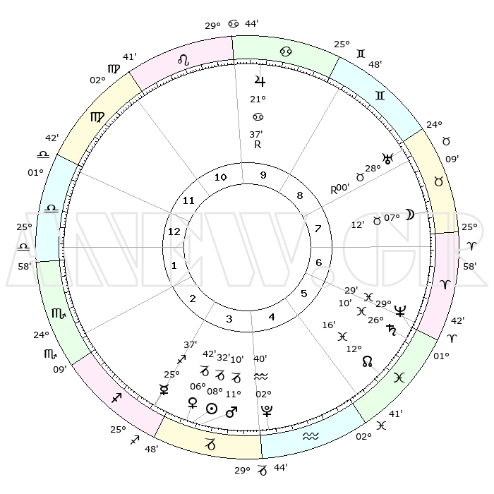 | | ΘΕΣΕΙΣ ΠΛΑΝΗΤΩΝ ΑΣΤΡΟΛΟΓΙΚΟΥ ΧΑΡΤΗ ΤΗΣ ΣΤΙΓΜΗΣ ΑΥΤΗΣ | | | | Πλανήτης | Ζώδιο | Μοίρες | Δεκαήμ. | Σε οίκο | Απόκλιση | | Ακμές των οίκων | | Ηλιος | Αιγόκερως | 08°27' | Πρώτο | 4 | 23 S 10 | | 1ος | 03°07' | Ζυγός | | Σελήνη | Ταύρος | 06°04' | Πρώτο | 8 | 17 N 27 | | 2ος | 29°56' | Ζυγός | | Ερμής | Τοξότης | 25°30' | Τρίτο | 3 | 23 S 42 | | 3ος | 00°29' | Τοξότης | | Αφροδίτη | Αιγόκερως | 06°36' | Πρώτο | 4 | 23 S 42 | | 4ος | 03°30' | Αιγόκερως | | Αρης | Αιγόκερως | 11°06' | Δεύτερο | 4 | 23 S 51 | | 5ος | 06°27' | Υδροχόος | | Δίας | Καρκίνος | 21°37'R | Τρίτο | 10 | 21 N 56 | | 6ος | 06°46' | Ιχθείς | | Κρόνος | Ιχθείς | 26°10' | Τρίτο | 6 | 03 S 36 | | 7ος | 03°07' | Κριός | | Ουρανός | Ταύρος | 28°00'R | Τρίτο | 8 | 19 N 31 | | 8ος | 29°56' | Κριός | | Ποσειδώνας | Ιχθείς | 29°29' | Τρίτο | 6 | 01 S 26 | | 9ος | 00°29' | Δίδυμοι | | Πλούτωνας | Υδροχόος | 02°40' | Πρώτο | 4 | 23 S 14 | | 10ος | 03°30' | Καρκίνος | | Β. Δεσμός | Ιχθείς | 12°17' | Δεύτερο | 6 | 06 S 57 | | 11ος | 06°27' | Λέων | | Ωροσκόπος | Ζυγός | 03°07' | Πρώτο | | | 12ος | 06°46' | Παρθένος | | Μεσουράνημα | Καρκίνος | 03°30' | Πρώτο | | | |