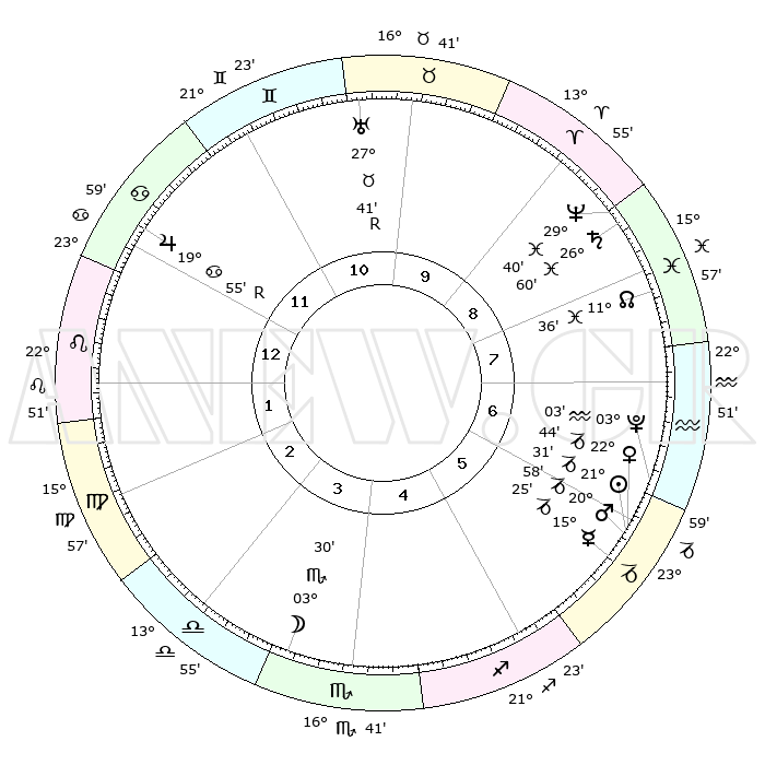 | | ΘΕΣΕΙΣ ΠΛΑΝΗΤΩΝ ΑΣΤΡΟΛΟΓΙΚΟΥ ΧΑΡΤΗ ΤΗΣ ΣΤΙΓΜΗΣ ΑΥΤΗΣ | | | | Πλανήτης | Ζώδιο | Μοίρες | Δεκαήμ. | Σε οίκο | Απόκλιση | | Ακμές των οίκων | | Ηλιος | Αιγόκερως | 21°14' | Τρίτο | 9 | 21 S 45 | | 1ος | 14°54' | Ταύρος | | Σελήνη | Σκορπιός | 00°02' | Πρώτο | 6 | 15 S 08 | | 2ος | 13°10' | Δίδυμοι | | Ερμής | Αιγόκερως | 14°57' | Δεύτερο | 9 | 24 S 08 | | 3ος | 05°24' | Καρκίνος | | Αφροδίτη | Αιγόκερως | 22°22' | Τρίτο | 9 | 22 S 26 | | 4ος | 27°22' | Καρκίνος | | Αρης | Αιγόκερως | 20°45' | Τρίτο | 9 | 22 S 46 | | 5ος | 23°30' | Λέων | | Δίας | Καρκίνος | 19°57'R | Δεύτερο | 3 | 22 N 13 | | 6ος | 29°12' | Παρθένος | | Κρόνος | Ιχθείς | 26°59' | Τρίτο | 11 | 03 S 15 | | 7ος | 14°54' | Σκορπιός | | Ουρανός | Ταύρος | 27°42'R | Τρίτο | 1 | 19 N 27 | | 8ος | 13°10' | Τοξότης | | Ποσειδώνας | Ιχθείς | 29°40' | Τρίτο | 12 | 01 S 21 | | 9ος | 05°24' | Αιγόκερως | | Πλούτωνας | Υδροχόος | 03°03' | Πρώτο | 10 | 23 S 09 | | 10ος | 27°22' | Αιγόκερως | | Β. Δεσμός | Ιχθείς | 11°37' | Δεύτερο | 11 | 07 S 12 | | 11ος | 23°30' | Υδροχόος | | Ωροσκόπος | Ταύρος | 14°54' | Δεύτερο | | | 12ος | 29°12' | Ιχθείς | | Μεσουράνημα | Αιγόκερως | 27°22' | Τρίτο | | | |