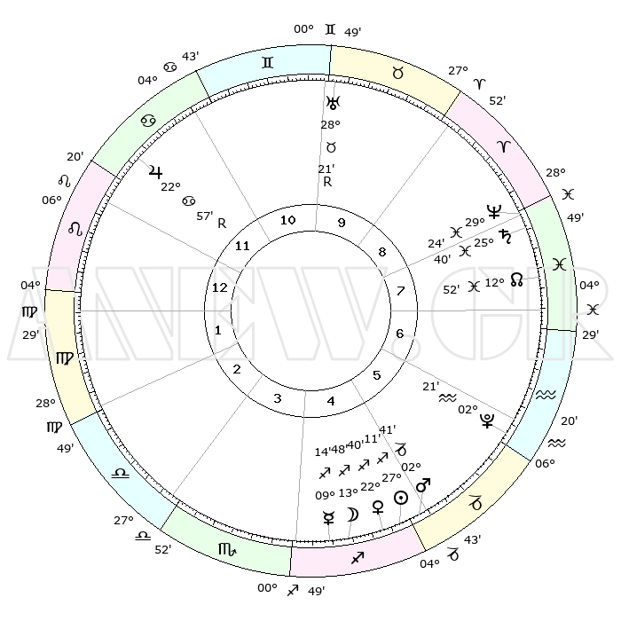 | | ΘΕΣΕΙΣ ΠΛΑΝΗΤΩΝ ΑΣΤΡΟΛΟΓΙΚΟΥ ΧΑΡΤΗ ΤΗΣ ΣΤΙΓΜΗΣ ΑΥΤΗΣ | | | | Πλανήτης | Ζώδιο | Μοίρες | Δεκαήμ. | Σε οίκο | Απόκλιση | | Ακμές των οίκων | | Ηλιος | Τοξότης | 27°07' | Τρίτο | 5 | 23 S 24 | | 1ος | 14°56' | Λέων | | Σελήνη | Τοξότης | 12°60' | Δεύτερο | 5 | 27 S 19 | | 2ος | 07°14' | Παρθένος | | Ερμής | Τοξότης | 09°08' | Πρώτο | 4 | 20 S 46 | | 3ος | 04°16' | Ζυγός | | Αφροδίτη | Τοξότης | 22°35' | Τρίτο | 5 | 23 S 13 | | 4ος | 06°41' | Σκορπιός | | Αρης | Αιγόκερως | 02°38' | Πρώτο | 5 | 24 S 12 | | 5ος | 11°58' | Τοξότης | | Δίας | Καρκίνος | 22°58'R | Τρίτο | 12 | 21 N 41 | | 6ος | 15°27' | Αιγόκερως | | Κρόνος | Ιχθείς | 25°39' | Τρίτο | 8 | 03 S 50 | | 7ος | 14°56' | Υδροχόος | | Ουρανός | Ταύρος | 28°22'R | Τρίτο | 10 | 19 N 36 | | 8ος | 07°14' | Ιχθείς | | Ποσειδώνας | Ιχθείς | 29°24' | Τρίτο | 8 | 01 S 28 | | 9ος | 04°16' | Κριός | | Πλούτωνας | Υδροχόος | 02°21' | Πρώτο | 6 | 23 S 18 | | 10ος | 06°41' | Ταύρος | | Β. Δεσμός | Ιχθείς | 12°52' | Δεύτερο | 8 | 06 S 44 | | 11ος | 11°58' | Δίδυμοι | | Ωροσκόπος | Λέων | 14°56' | Δεύτερο | | | 12ος | 15°27' | Καρκίνος | | Μεσουράνημα | Ταύρος | 06°41' | Πρώτο | | | |