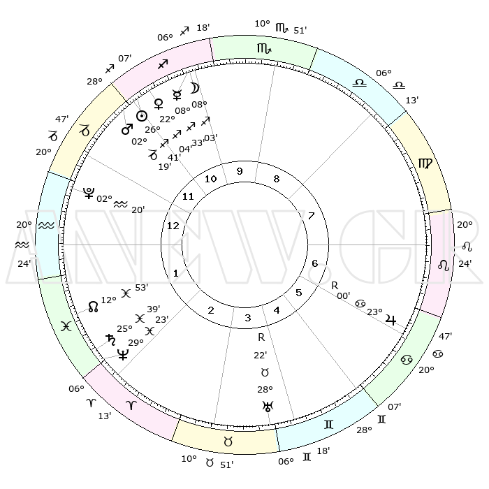 | | ΘΕΣΕΙΣ ΠΛΑΝΗΤΩΝ ΑΣΤΡΟΛΟΓΙΚΟΥ ΧΑΡΤΗ ΤΗΣ ΣΤΙΓΜΗΣ ΑΥΤΗΣ | | | | Πλανήτης | Ζώδιο | Μοίρες | Δεκαήμ. | Σε οίκο | Απόκλιση | | Ακμές των οίκων | | Ηλιος | Τοξότης | 26°22' | Τρίτο | 2 | 23 S 23 | | 1ος | 03°37' | Σκορπιός | | Σελήνη | Τοξότης | 04°19' | Πρώτο | 2 | 25 S 52 | | 2ος | 02°15' | Τοξότης | | Ερμής | Τοξότης | 08°07' | Πρώτο | 2 | 20 S 31 | | 3ος | 04°30' | Αιγόκερως | | Αφροδίτη | Τοξότης | 21°40' | Τρίτο | 2 | 23 S 08 | | 4ος | 08°57' | Υδροχόος | | Αρης | Αιγόκερως | 02°05' | Πρώτο | 2 | 24 S 13 | | 5ος | 11°49' | Ιχθείς | | Δίας | Καρκίνος | 23°03'R | Τρίτο | 9 | 21 N 40 | | 6ος | 10°08' | Κριός | | Κρόνος | Ιχθείς | 25°38' | Τρίτο | 5 | 03 S 51 | | 7ος | 03°37' | Ταύρος | | Ουρανός | Ταύρος | 28°23'R | Τρίτο | 7 | 19 N 36 | | 8ος | 02°15' | Δίδυμοι | | Ποσειδώνας | Ιχθείς | 29°23' | Τρίτο | 5 | 01 S 28 | | 9ος | 04°30' | Καρκίνος | | Πλούτωνας | Υδροχόος | 02°19' | Πρώτο | 3 | 23 S 18 | | 10ος | 08°57' | Λέων | | Β. Δεσμός | Ιχθείς | 12°54' | Δεύτερο | 5 | 06 S 43 | | 11ος | 11°49' | Παρθένος | | Ωροσκόπος | Σκορπιός | 03°37' | Πρώτο | | | 12ος | 10°08' | Ζυγός | | Μεσουράνημα | Λέων | 08°57' | Πρώτο | | | |
