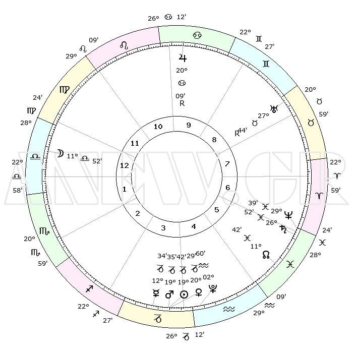 | | ΘΕΣΕΙΣ ΠΛΑΝΗΤΩΝ ΑΣΤΡΟΛΟΓΙΚΟΥ ΧΑΡΤΗ ΤΗΣ ΣΤΙΓΜΗΣ ΑΥΤΗΣ | | | | Πλανήτης | Ζώδιο | Μοίρες | Δεκαήμ. | Σε οίκο | Απόκλιση | | Ακμές των οίκων | | Ηλιος | Αιγόκερως | 19°04' | Δεύτερο | 11 | 22 S 05 | | 1ος | 03°48' | Ιχθείς | | Σελήνη | Ζυγός | 04°10' | Πρώτο | 7 | 03 S 34 | | 2ος | 18°52' | Κριός | | Ερμής | Αιγόκερως | 11°36' | Δεύτερο | 11 | 24 S 18 | | 3ος | 20°50' | Ταύρος | | Αφροδίτη | Αιγόκερως | 19°42' | Δεύτερο | 11 | 22 S 47 | | 4ος | 14°53' | Δίδυμοι | | Αρης | Αιγόκερως | 19°07' | Δεύτερο | 11 | 23 S 00 | | 5ος | 06°34' | Καρκίνος | | Δίας | Καρκίνος | 20°14'R | Τρίτο | 5 | 22 N 10 | | 6ος | 00°31' | Λέων | | Κρόνος | Ιχθείς | 26°49' | Τρίτο | 1 | 03 S 19 | | 7ος | 03°48' | Παρθένος | | Ουρανός | Ταύρος | 27°44'R | Τρίτο | 3 | 19 N 28 | | 8ος | 18°52' | Ζυγός | | Ποσειδώνας | Ιχθείς | 29°38' | Τρίτο | 1 | 01 S 22 | | 9ος | 20°50' | Σκορπιός | | Πλούτωνας | Υδροχόος | 02°59' | Πρώτο | 12 | 23 S 10 | | 10ος | 14°53' | Τοξότης | | Β. Δεσμός | Ιχθείς | 11°44' | Δεύτερο | 1 | 07 S 10 | | 11ος | 06°34' | Αιγόκερως | | Ωροσκόπος | Ιχθείς | 03°48' | Πρώτο | | | 12ος | 00°31' | Υδροχόος | | Μεσουράνημα | Τοξότης | 14°53' | Δεύτερο | | | |
