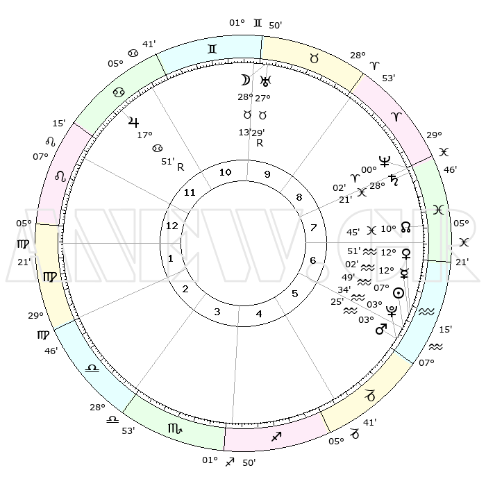 | | ΘΕΣΕΙΣ ΠΛΑΝΗΤΩΝ ΑΣΤΡΟΛΟΓΙΚΟΥ ΧΑΡΤΗ ΤΗΣ ΣΤΙΓΜΗΣ ΑΥΤΗΣ | | | | Πλανήτης | Ζώδιο | Μοίρες | Δεκαήμ. | Σε οίκο | Απόκλιση | | Ακμές των οίκων | | Ηλιος | Υδροχόος | 07°45' | Πρώτο | 6 | 18 S 20 | | 1ος | 18°48' | Λέων | | Σελήνη | Ταύρος | 27°24' | Τρίτο | 10 | 24 N 32 | | 2ος | 11°30' | Παρθένος | | Ερμής | Υδροχόος | 11°56' | Δεύτερο | 6 | 19 S 11 | | 3ος | 08°60' | Ζυγός | | Αφροδίτη | Υδροχόος | 12°47' | Δεύτερο | 6 | 18 S 12 | | 4ος | 11°37' | Σκορπιός | | Αρης | Υδροχόος | 03°22' | Πρώτο | 6 | 20 S 24 | | 5ος | 16°37' | Τοξότης | | Δίας | Καρκίνος | 17°51'R | Δεύτερο | 11 | 22 N 32 | | 6ος | 19°38' | Αιγόκερως | | Κρόνος | Ιχθείς | 28°21' | Τρίτο | 8 | 02 S 40 | | 7ος | 18°48' | Υδροχόος | | Ουρανός | Ταύρος | 27°29'R | Τρίτο | 10 | 19 N 24 | | 8ος | 11°30' | Ιχθείς | | Ποσειδώνας | Κριός | 00°02' | Πρώτο | 8 | 01 S 12 | | 9ος | 08°60' | Κριός | | Πλούτωνας | Υδροχόος | 03°34' | Πρώτο | 6 | 23 S 03 | | 10ος | 11°37' | Ταύρος | | Β. Δεσμός | Ιχθείς | 10°45' | Δεύτερο | 7 | 07 S 32 | | 11ος | 16°37' | Δίδυμοι | | Ωροσκόπος | Λέων | 18°48' | Δεύτερο | | | 12ος | 19°38' | Καρκίνος | | Μεσουράνημα | Ταύρος | 11°37' | Δεύτερο | | | |