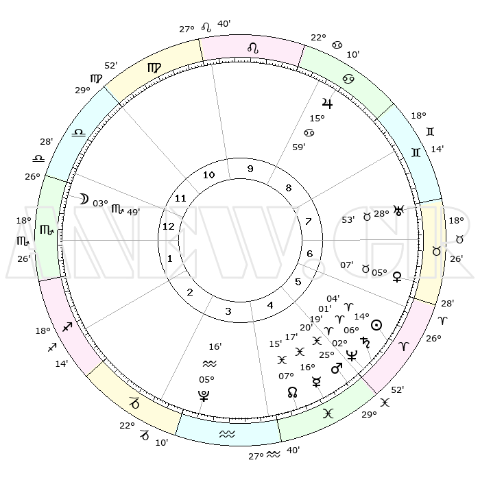 | | ΘΕΣΕΙΣ ΠΛΑΝΗΤΩΝ ΑΣΤΡΟΛΟΓΙΚΟΥ ΧΑΡΤΗ ΤΗΣ ΣΤΙΓΜΗΣ ΑΥΤΗΣ | | | | Πλανήτης | Ζώδιο | Μοίρες | Δεκαήμ. | Σε οίκο | Απόκλιση | | Ακμές των οίκων | | Ηλιος | Κριός | 13°60' | Δεύτερο | 6 | 05 N 31 | | 1ος | 28°30' | Ζυγός | | Σελήνη | Σκορπιός | 02°58' | Πρώτο | 1 | 16 S 27 | | 2ος | 26°50' | Σκορπιός | | Ερμής | Ιχθείς | 16°13' | Δεύτερο | 5 | 07 S 00 | | 3ος | 28°40' | Τοξότης | | Αφροδίτη | Ταύρος | 05°02' | Πρώτο | 7 | 12 N 53 | | 4ος | 02°45' | Υδροχόος | | Αρης | Ιχθείς | 25°16' | Τρίτο | 5 | 02 S 50 | | 5ος | 05°41' | Ιχθείς | | Δίας | Καρκίνος | 15°58' | Δεύτερο | 9 | 22 N 51 | | 6ος | 04°30' | Κριός | | Κρόνος | Κριός | 06°00' | Πρώτο | 6 | 00 N 26 | | 7ος | 28°30' | Κριός | | Ουρανός | Ταύρος | 28°53' | Τρίτο | 8 | 19 N 44 | | 8ος | 26°50' | Ταύρος | | Ποσειδώνας | Κριός | 02°19' | Πρώτο | 5 | 00 S 17 | | 9ος | 28°40' | Δίδυμοι | | Πλούτωνας | Υδροχόος | 05°16' | Πρώτο | 4 | 22 S 47 | | 10ος | 02°45' | Λέων | | Β. Δεσμός | Ιχθείς | 07°15' | Πρώτο | 5 | 08 S 51 | | 11ος | 05°41' | Παρθένος | | Ωροσκόπος | Ζυγός | 28°30' | Τρίτο | | | 12ος | 04°30' | Ζυγός | | Μεσουράνημα | Λέων | 02°45' | Πρώτο | | | |
