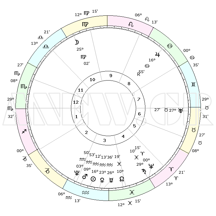 | | ΘΕΣΕΙΣ ΠΛΑΝΗΤΩΝ ΑΣΤΡΟΛΟΓΙΚΟΥ ΧΑΡΤΗ ΤΗΣ ΣΤΙΓΜΗΣ ΑΥΤΗΣ | | | | Πλανήτης | Ζώδιο | Μοίρες | Δεκαήμ. | Σε οίκο | Απόκλιση | | Ακμές των οίκων | | Ηλιος | Υδροχόος | 16°06' | Δεύτερο | 4 | 16 S 00 | | 1ος | 02°56' | Σκορπιός | | Σελήνη | Παρθένος | 23°51' | Τρίτο | 11 | 01 N 13 | | 2ος | 01°32' | Τοξότης | | Ερμής | Υδροχόος | 26°26' | Τρίτο | 4 | 14 S 11 | | 3ος | 03°44' | Αιγόκερως | | Αφροδίτη | Υδροχόος | 23°06' | Τρίτο | 4 | 15 S 09 | | 4ος | 08°08' | Υδροχόος | | Αρης | Υδροχόος | 09°49' | Πρώτο | 4 | 18 S 48 | | 5ος | 10°60' | Ιχθείς | | Δίας | Καρκίνος | 16°56'R | Δεύτερο | 9 | 22 N 40 | | 6ος | 09°24' | Κριός | | Κρόνος | Ιχθείς | 29°09' | Τρίτο | 5 | 02 S 20 | | 7ος | 02°56' | Ταύρος | | Ουρανός | Ταύρος | 27°27' | Τρίτο | 7 | 19 N 24 | | 8ος | 01°32' | Δίδυμοι | | Ποσειδώνας | Κριός | 00°15' | Πρώτο | 5 | 01 S 06 | | 9ος | 03°44' | Καρκίνος | | Πλούτωνας | Υδροχόος | 03°49' | Πρώτο | 3 | 23 S 00 | | 10ος | 08°08' | Λέων | | Β. Δεσμός | Ιχθείς | 10°19' | Δεύτερο | 4 | 07 S 42 | | 11ος | 10°60' | Παρθένος | | Ωροσκόπος | Σκορπιός | 02°56' | Πρώτο | | | 12ος | 09°24' | Ζυγός | | Μεσουράνημα | Λέων | 08°08' | Πρώτο | | | |
