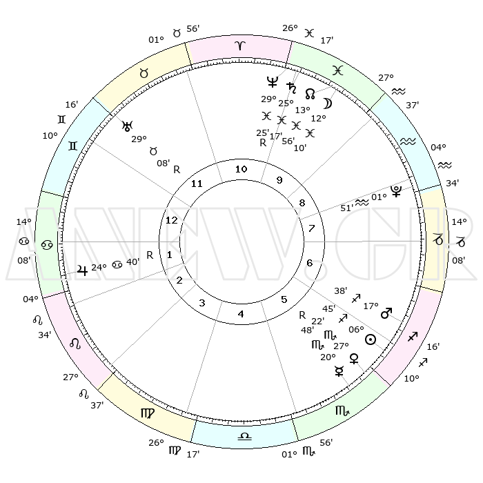 | | ΘΕΣΕΙΣ ΠΛΑΝΗΤΩΝ ΑΣΤΡΟΛΟΓΙΚΟΥ ΧΑΡΤΗ ΤΗΣ ΣΤΙΓΜΗΣ ΑΥΤΗΣ | | | | Πλανήτης | Ζώδιο | Μοίρες | Δεκαήμ. | Σε οίκο | Απόκλιση | | Ακμές των οίκων | | Ηλιος | Τοξότης | 06°43' | Πρώτο | 6 | 21 S 26 | | 1ος | 06°47' | Καρκίνος | | Σελήνη | Ιχθείς | 11°51' | Δεύτερο | 9 | 07 S 19 | | 2ος | 27°17' | Καρκίνος | | Ερμής | Σκορπιός | 20°48'R | Τρίτο | 5 | 15 S 34 | | 3ος | 19°36' | Λέων | | Αφροδίτη | Σκορπιός | 27°20' | Τρίτο | 5 | 18 S 48 | | 4ος | 17°01' | Παρθένος | | Αρης | Τοξότης | 17°37' | Δεύτερο | 6 | 23 S 30 | | 5ος | 21°56' | Ζυγός | | Δίας | Καρκίνος | 24°40'R | Τρίτο | 1 | 21 N 20 | | 6ος | 01°17' | Τοξότης | | Κρόνος | Ιχθείς | 25°17' | Τρίτο | 10 | 04 S 03 | | 7ος | 06°47' | Αιγόκερως | | Ουρανός | Ταύρος | 29°08'R | Τρίτο | 11 | 19 N 46 | | 8ος | 27°16' | Αιγόκερως | | Ποσειδώνας | Ιχθείς | 29°25'R | Τρίτο | 10 | 01 S 29 | | 9ος | 19°36' | Υδροχόος | | Πλούτωνας | Υδροχόος | 01°51' | Πρώτο | 8 | 23 S 25 | | 10ος | 17°01' | Ιχθείς | | Β. Δεσμός | Ιχθείς | 13°56' | Δεύτερο | 9 | 06 S 19 | | 11ος | 21°56' | Κριός | | Ωροσκόπος | Καρκίνος | 06°47' | Πρώτο | | | 12ος | 01°17' | Δίδυμοι | | Μεσουράνημα | Ιχθείς | 17°01' | Δεύτερο | | | |