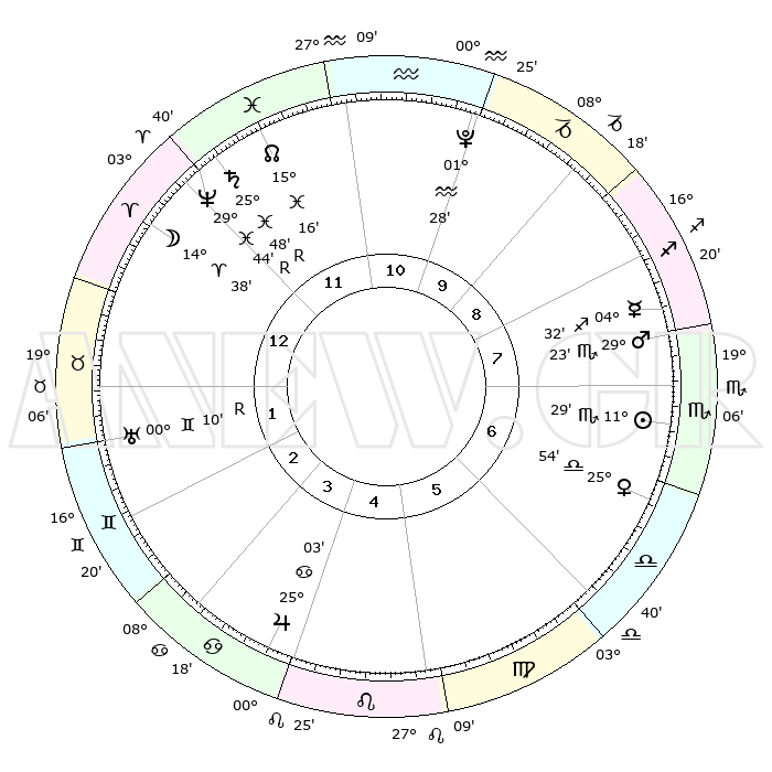 | | ΘΕΣΕΙΣ ΠΛΑΝΗΤΩΝ ΑΣΤΡΟΛΟΓΙΚΟΥ ΧΑΡΤΗ ΤΗΣ ΣΤΙΓΜΗΣ ΑΥΤΗΣ | | | | Πλανήτης | Ζώδιο | Μοίρες | Δεκαήμ. | Σε οίκο | Απόκλιση | | Ακμές των οίκων | | Ηλιος | Σκορπιός | 11°11' | Δεύτερο | 10 | 15 S 11 | | 1ος | 26°41' | Τοξότης | | Σελήνη | Κριός | 10°16' | Δεύτερο | 3 | 05 N 55 | | 2ος | 02°60' | Υδροχόος | | Ερμής | Τοξότης | 04°19' | Πρώτο | 11 | 23 S 50 | | 3ος | 12°43' | Ιχθείς | | Αφροδίτη | Ζυγός | 25°32' | Τρίτο | 10 | 08 S 31 | | 4ος | 17°10' | Κριός | | Αρης | Σκορπιός | 29°10' | Τρίτο | 11 | 20 S 22 | | 5ος | 14°01' | Ταύρος | | Δίας | Καρκίνος | 25°02' | Τρίτο | 7 | 21 N 12 | | 6ος | 06°03' | Δίδυμοι | | Κρόνος | Ιχθείς | 25°49'R | Τρίτο | 3 | 03 S 55 | | 7ος | 26°40' | Δίδυμοι | | Ουρανός | Δίδυμοι | 00°11'R | Πρώτο | 5 | 19 N 59 | | 8ος | 02°60' | Λέων | | Ποσειδώνας | Ιχθείς | 29°45'R | Τρίτο | 3 | 01 S 21 | | 9ος | 12°43' | Παρθένος | | Πλούτωνας | Υδροχόος | 01°28' | Πρώτο | 1 | 23 S 30 | | 10ος | 17°10' | Ζυγός | | Β. Δεσμός | Ιχθείς | 15°16' | Δεύτερο | 3 | 05 S 48 | | 11ος | 14°01' | Σκορπιός | | Ωροσκόπος | Τοξότης | 26°41' | Τρίτο | | | 12ος | 06°03' | Τοξότης | | Μεσουράνημα | Ζυγός | 17°10' | Δεύτερο | | | |