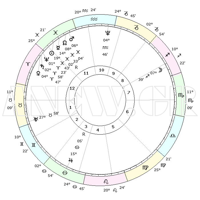 | | ΘΕΣΕΙΣ ΠΛΑΝΗΤΩΝ ΑΣΤΡΟΛΟΓΙΚΟΥ ΧΑΡΤΗ ΤΗΣ ΣΤΙΓΜΗΣ ΑΥΤΗΣ | | | | Πλανήτης | Ζώδιο | Μοίρες | Δεκαήμ. | Σε οίκο | Απόκλιση | | Ακμές των οίκων | | Ηλιος | Ιχθείς | 19°40' | Δεύτερο | 12 | 04 S 06 | | 1ος | 09°10' | Κριός | | Σελήνη | Τοξότης | 06°57' | Πρώτο | 8 | 26 S 39 | | 2ος | 17°08' | Ταύρος | | Ερμής | Ιχθείς | 14°06'R | Δεύτερο | 12 | 03 S 10 | | 3ος | 13°12' | Δίδυμοι | | Αφροδίτη | Κριός | 04°43' | Πρώτο | 12 | 00 N 48 | | 4ος | 05°10' | Καρκίνος | | Αρης | Ιχθείς | 06°02' | Πρώτο | 12 | 10 S 19 | | 5ος | 27°56' | Καρκίνος | | Δίας | Καρκίνος | 15°05'R | Δεύτερο | 4 | 22 N 56 | | 6ος | 26°49' | Λέων | | Κρόνος | Κριός | 02°57' | Πρώτο | 12 | 00 S 47 | | 7ος | 09°10' | Ζυγός | | Ουρανός | Ταύρος | 27°58' | Τρίτο | 2 | 19 N 32 | | 8ος | 17°08' | Σκορπιός | | Ποσειδώνας | Κριός | 01°23' | Πρώτο | 12 | 00 S 39 | | 9ος | 13°12' | Τοξότης | | Πλούτωνας | Υδροχόος | 04°46' | Πρώτο | 11 | 22 S 50 | | 10ος | 05°10' | Αιγόκερως | | Β. Δεσμός | Ιχθείς | 08°33' | Πρώτο | 12 | 08 S 22 | | 11ος | 27°56' | Αιγόκερως | | Ωροσκόπος | Κριός | 09°10' | Πρώτο | | | 12ος | 26°49' | Υδροχόος | | Μεσουράνημα | Αιγόκερως | 05°10' | Πρώτο | | | |