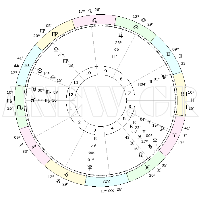 | ΘΕΣΕΙΣ ΠΛΑΝΗΤΩΝ ΑΣΤΡΟΛΟΓΙΚΟΥ ΧΑΡΤΗ ΤΗΣ ΣΤΙΓΜΗΣ ΑΥΤΗΣ | | Πλανήτης | Ζώδιο | Μοίρες | Δεκαήμ. | Σε οίκο | Απόκλιση | | Ακμές των οίκων | Ηλιος | Ζυγός | 14°11' | Δεύτερο | 12 | 05 S 35 | | 1ος | 16°58' | Ζυγός | Σελήνη | Κριός | 14°42' | Δεύτερο | 6 | 07 N 57 | | 2ος | 14°38' | Σκορπιός | Ερμής | Σκορπιός | 00°46' | Πρώτο | 1 | 12 S 32 | | 3ος | 15°46' | Τοξότης | Αφροδίτη | Παρθένος | 21°44' | Τρίτο | 11 | 04 N 35 | | 4ος | 19°13' | Αιγόκερως | Αρης | Σκορπιός | 10°07' | Δεύτερο | 1 | 14 S 59 | | 5ος | 22°10' | Υδροχόος | Δίας | Καρκίνος | 23°10' | Τρίτο | 10 | 21 N 29 | | 6ος | 21°48' | Ιχθείς | Κρόνος | Ιχθείς | 27°26'R | Τρίτο | 6 | 03 S 20 | | 7ος | 16°58' | Κριός | Ουρανός | Δίδυμοι | 01°04'R | Πρώτο | 8 | 20 N 10 | | 8ος | 14°38' | Ταύρος | Ποσειδώνας | Κριός | 00°23'R | Πρώτο | 6 | 01 S 07 | | 9ος | 15°46' | Δίδυμοι | Πλούτωνας | Υδροχόος | 01°23'R | Πρώτο | 4 | 23 S 32 | | 10ος | 19°13' | Καρκίνος | Β. Δεσμός | Ιχθείς | 16°43' | Δεύτερο | 5 | 05 S 15 | | 11ος | 22°10' | Λέων | Ωροσκόπος | Ζυγός | 16°58' | Δεύτερο | | | 12ος | 21°48' | Παρθένος | Μεσουράνημα | Καρκίνος | 19°13' | Δεύτερο | | | |