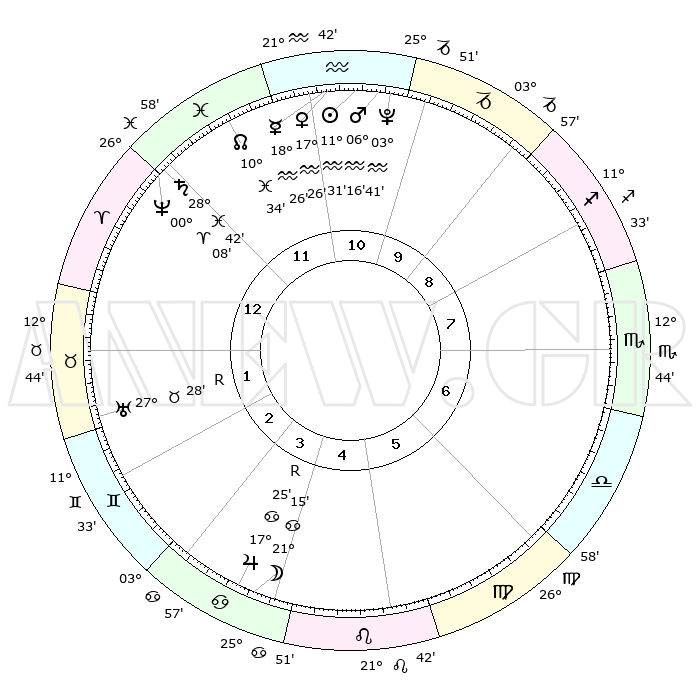 | | ΘΕΣΕΙΣ ΠΛΑΝΗΤΩΝ ΑΣΤΡΟΛΟΓΙΚΟΥ ΧΑΡΤΗ ΤΗΣ ΣΤΙΓΜΗΣ ΑΥΤΗΣ | | | | Πλανήτης | Ζώδιο | Μοίρες | Δεκαήμ. | Σε οίκο | Απόκλιση | | Ακμές των οίκων | | Ηλιος | Υδροχόος | 11°28' | Δεύτερο | 11 | 17 S 20 | | 1ος | 11°51' | Κριός | | Σελήνη | Καρκίνος | 20°25' | Τρίτο | 4 | 25 N 45 | | 2ος | 19°05' | Ταύρος | | Ερμής | Υδροχόος | 18°20' | Δεύτερο | 11 | 17 S 09 | | 3ος | 14°48' | Δίδυμοι | | Αφροδίτη | Υδροχόος | 17°22' | Δεύτερο | 11 | 16 S 55 | | 4ος | 06°41' | Καρκίνος | | Αρης | Υδροχόος | 06°13' | Πρώτο | 11 | 19 S 43 | | 5ος | 29°37' | Καρκίνος | | Δίας | Καρκίνος | 17°26'R | Δεύτερο | 4 | 22 N 36 | | 6ος | 28°57' | Λέων | | Κρόνος | Ιχθείς | 28°42' | Τρίτο | 12 | 02 S 31 | | 7ος | 11°51' | Ζυγός | | Ουρανός | Ταύρος | 27°28'R | Τρίτο | 2 | 19 N 24 | | 8ος | 19°05' | Σκορπιός | | Ποσειδώνας | Κριός | 00°08' | Πρώτο | 12 | 01 S 09 | | 9ος | 14°48' | Τοξότης | | Πλούτωνας | Υδροχόος | 03°41' | Πρώτο | 11 | 23 S 02 | | 10ος | 06°41' | Αιγόκερως | | Β. Δεσμός | Ιχθείς | 10°34' | Δεύτερο | 12 | 07 S 36 | | 11ος | 29°37' | Αιγόκερως | | Ωροσκόπος | Κριός | 11°51' | Δεύτερο | | | 12ος | 28°57' | Υδροχόος | | Μεσουράνημα | Αιγόκερως | 06°41' | Πρώτο | | | |