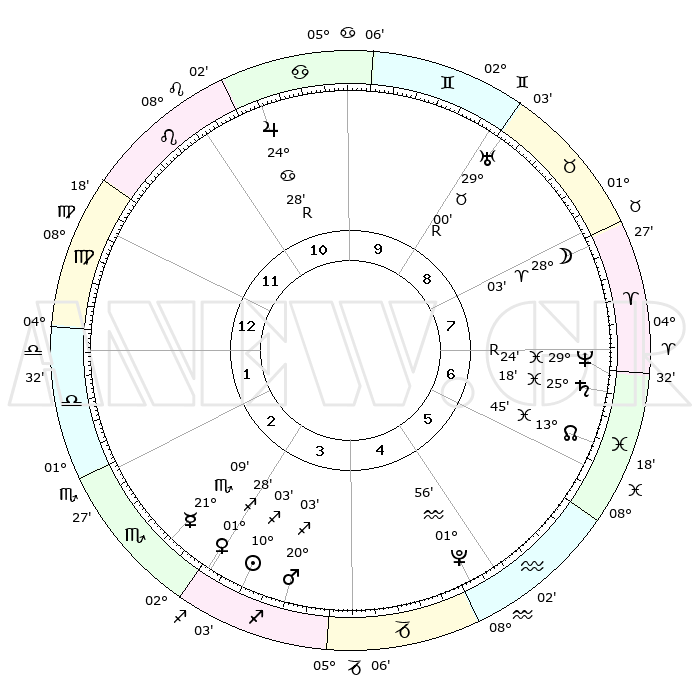 | | ΘΕΣΕΙΣ ΠΛΑΝΗΤΩΝ ΑΣΤΡΟΛΟΓΙΚΟΥ ΧΑΡΤΗ ΤΗΣ ΣΤΙΓΜΗΣ ΑΥΤΗΣ | | | | Πλανήτης | Ζώδιο | Μοίρες | Δεκαήμ. | Σε οίκο | Απόκλιση | | Ακμές των οίκων | | Ηλιος | Τοξότης | 10°02' | Δεύτερο | 3 | 21 S 57 | | 1ος | 25°44' | Παρθένος | | Σελήνη | Κριός | 27°36' | Τρίτο | 8 | 13 N 50 | | 2ος | 21°60' | Ζυγός | | Ερμής | Σκορπιός | 21°08' | Τρίτο | 2 | 15 S 31 | | 3ος | 22°16' | Σκορπιός | | Αφροδίτη | Τοξότης | 01°26' | Πρώτο | 3 | 19 S 47 | | 4ος | 25°12' | Τοξότης | | Αρης | Τοξότης | 20°02' | Τρίτο | 3 | 23 S 44 | | 5ος | 28°15' | Αιγόκερως | | Δίας | Καρκίνος | 24°28'R | Τρίτο | 10 | 21 N 23 | | 6ος | 28°51' | Υδροχόος | | Κρόνος | Ιχθείς | 25°18' | Τρίτο | 6 | 04 S 03 | | 7ος | 25°44' | Ιχθείς | | Ουρανός | Ταύρος | 29°00'R | Τρίτο | 9 | 19 N 44 | | 8ος | 21°60' | Κριός | | Ποσειδώνας | Ιχθείς | 29°24'R | Τρίτο | 7 | 01 S 29 | | 9ος | 22°16' | Ταύρος | | Πλούτωνας | Υδροχόος | 01°56' | Πρώτο | 5 | 23 S 24 | | 10ος | 25°12' | Δίδυμοι | | Β. Δεσμός | Ιχθείς | 13°46' | Δεύτερο | 6 | 06 S 23 | | 11ος | 28°15' | Καρκίνος | | Ωροσκόπος | Παρθένος | 25°44' | Τρίτο | | | 12ος | 28°51' | Λέων | | Μεσουράνημα | Δίδυμοι | 25°12' | Τρίτο | | | |
