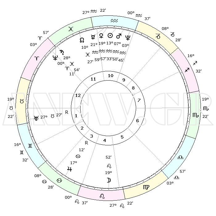 | | ΘΕΣΕΙΣ ΠΛΑΝΗΤΩΝ ΑΣΤΡΟΛΟΓΙΚΟΥ ΧΑΡΤΗ ΤΗΣ ΣΤΙΓΜΗΣ ΑΥΤΗΣ | | | | Πλανήτης | Ζώδιο | Μοίρες | Δεκαήμ. | Σε οίκο | Απόκλιση | | Ακμές των οίκων | | Ηλιος | Υδροχόος | 13°30' | Δεύτερο | 11 | 16 S 46 | | 1ος | 18°35' | Κριός | | Σελήνη | Λέων | 19°02' | Δεύτερο | 5 | 16 N 49 | | 2ος | 23°59' | Ταύρος | | Ερμής | Υδροχόος | 21°52' | Τρίτο | 11 | 15 S 55 | | 3ος | 18°50' | Δίδυμοι | | Αφροδίτη | Υδροχόος | 19°53' | Δεύτερο | 11 | 16 S 09 | | 4ος | 10°35' | Καρκίνος | | Αρης | Υδροχόος | 07°48' | Πρώτο | 11 | 19 S 20 | | 5ος | 03°59' | Λέων | | Δίας | Καρκίνος | 17°12'R | Δεύτερο | 4 | 22 N 38 | | 6ος | 04°31' | Παρθένος | | Κρόνος | Ιχθείς | 28°53' | Τρίτο | 12 | 02 S 26 | | 7ος | 18°35' | Ζυγός | | Ουρανός | Ταύρος | 27°27'R | Τρίτο | 2 | 19 N 24 | | 8ος | 23°59' | Σκορπιός | | Ποσειδώνας | Κριός | 00°11' | Πρώτο | 12 | 01 S 08 | | 9ος | 18°50' | Τοξότης | | Πλούτωνας | Υδροχόος | 03°45' | Πρώτο | 10 | 23 S 01 | | 10ος | 10°35' | Αιγόκερως | | Β. Δεσμός | Ιχθείς | 10°27' | Δεύτερο | 12 | 07 S 39 | | 11ος | 03°59' | Υδροχόος | | Ωροσκόπος | Κριός | 18°35' | Δεύτερο | | | 12ος | 04°31' | Ιχθείς | | Μεσουράνημα | Αιγόκερως | 10°35' | Δεύτερο | | | |