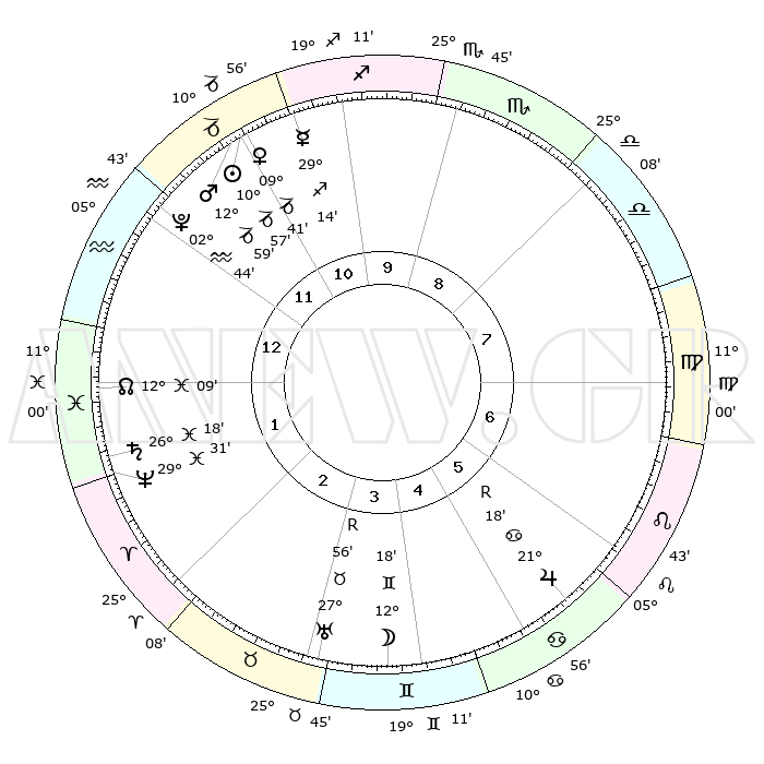 | | ΘΕΣΕΙΣ ΠΛΑΝΗΤΩΝ ΑΣΤΡΟΛΟΓΙΚΟΥ ΧΑΡΤΗ ΤΗΣ ΣΤΙΓΜΗΣ ΑΥΤΗΣ | | | | Πλανήτης | Ζώδιο | Μοίρες | Δεκαήμ. | Σε οίκο | Απόκλιση | | Ακμές των οίκων | | Ηλιος | Αιγόκερως | 10°52' | Δεύτερο | 12 | 22 S 59 | | 1ος | 01°53' | Υδροχόος | | Σελήνη | Δίδυμοι | 11°08' | Δεύτερο | 4 | 27 N 07 | | 2ος | 16°17' | Ιχθείς | | Ερμής | Τοξότης | 29°07' | Τρίτο | 11 | 24 S 02 | | 3ος | 24°25' | Κριός | | Αφροδίτη | Αιγόκερως | 09°35' | Πρώτο | 12 | 23 S 36 | | 4ος | 22°34' | Ταύρος | | Αρης | Αιγόκερως | 12°55' | Δεύτερο | 12 | 23 S 42 | | 5ος | 15°12' | Δίδυμοι | | Δίας | Καρκίνος | 21°19'R | Τρίτο | 6 | 21 N 59 | | 6ος | 06°41' | Καρκίνος | | Κρόνος | Ιχθείς | 26°18' | Τρίτο | 2 | 03 S 33 | | 7ος | 01°53' | Λέων | | Ουρανός | Ταύρος | 27°56'R | Τρίτο | 4 | 19 N 30 | | 8ος | 16°17' | Παρθένος | | Ποσειδώνας | Ιχθείς | 29°31' | Τρίτο | 2 | 01 S 25 | | 9ος | 24°25' | Ζυγός | | Πλούτωνας | Υδροχόος | 02°44' | Πρώτο | 1 | 23 S 13 | | 10ος | 22°34' | Σκορπιός | | Β. Δεσμός | Ιχθείς | 12°09' | Δεύτερο | 1 | 07 S 00 | | 11ος | 15°12' | Τοξότης | | Ωροσκόπος | Υδροχόος | 01°53' | Πρώτο | | | 12ος | 06°41' | Αιγόκερως | | Μεσουράνημα | Σκορπιός | 22°34' | Τρίτο | | | |